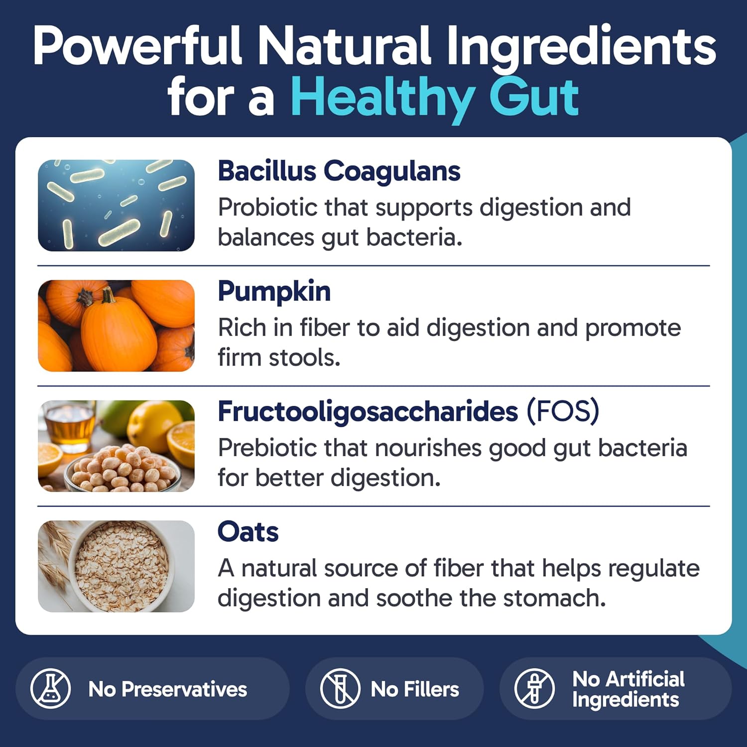 - Powered By Natureâs Best Ingredients: With pumpkin, oats, and FOS, these chews provide natural dog digestive support using fiber-rich, prebiotic, and probiotic ingredients for well-rounded gut health.