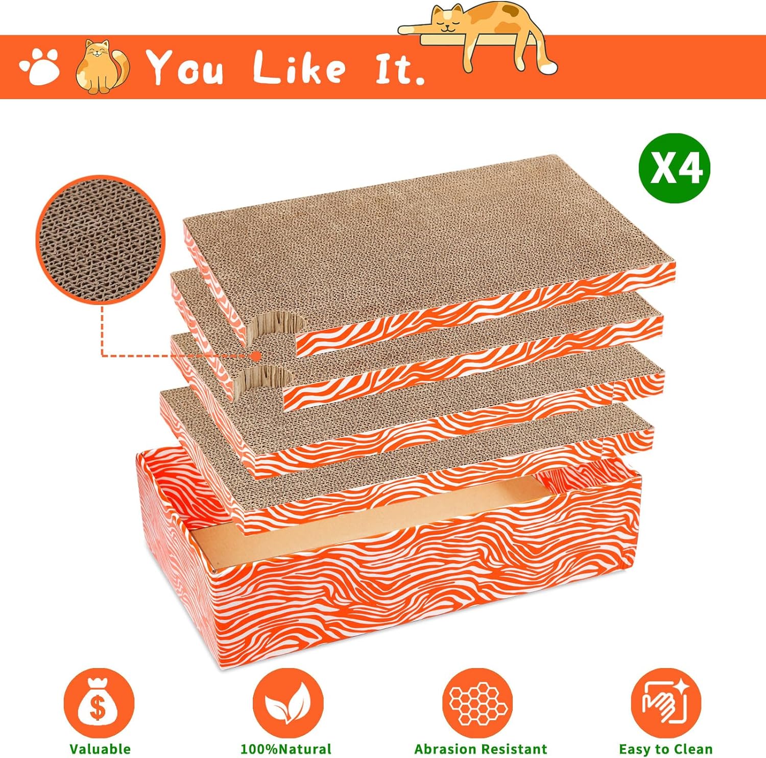 - đťăValueableăďźRefillable, Reverable Usage and Long Lasting, kitty scratcher box including 4 pcs high density carboard , two sides of each board can be scratched, it means long lasting for monthes due to 8 sides totally can be scratched.