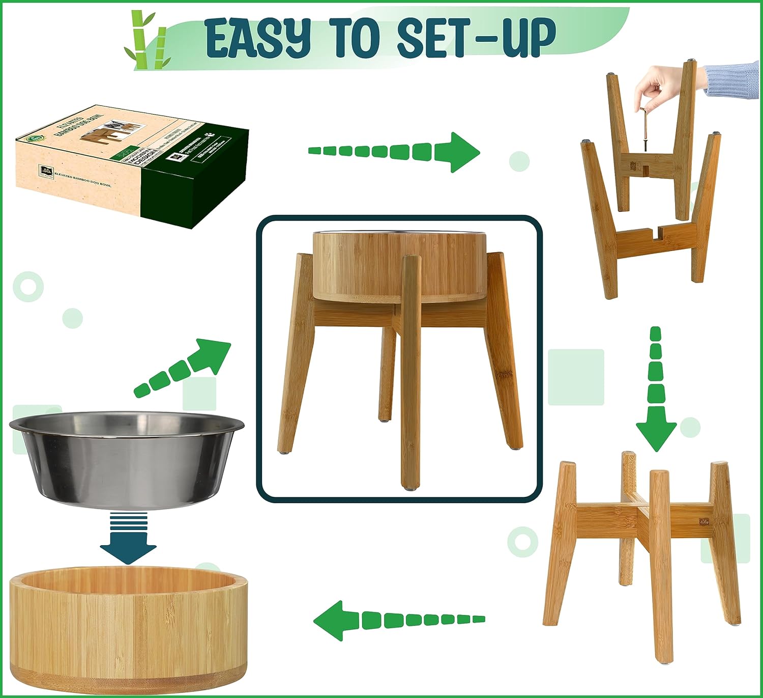 - Removable, Easy to Assemble â All components of this elevated dog bowl are removable and it is easy to assemble, making it perfect for travel and outdoor adventures. Pack it in your dog's travel bag or car compartment, and ensure your pet enjoys a comfortable meal wherever you go.