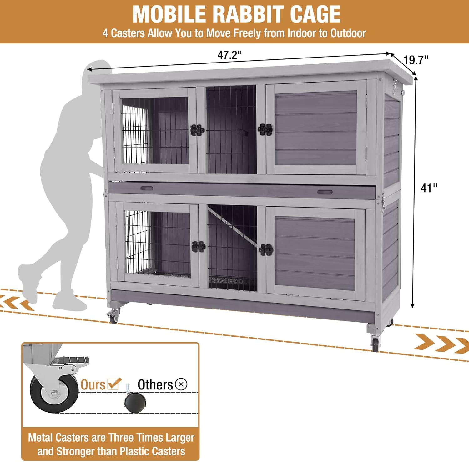- Four Casters: Move the hutch around your yard or home with casters, allowing your rabbits to enjoy different environments and ensuring easy cleaning