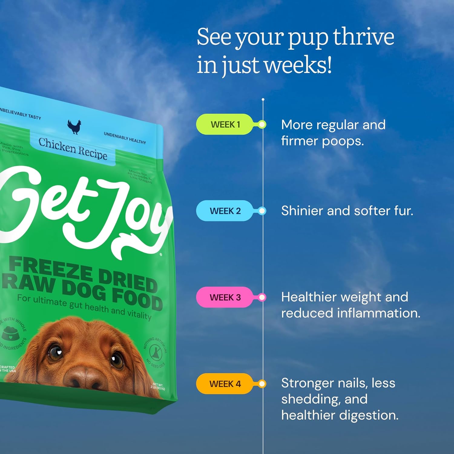 - Contains: (1) 32-Ounce Resealable Bag of Get Joy Gut Health Fresh Freeze Dried, Chicken Recipe. Our dog food is scoopable, pantry-friendly and ideal for owners who need nutrition with convenience - skip messy bowls, avoid freshness headaches, and free up freezer space