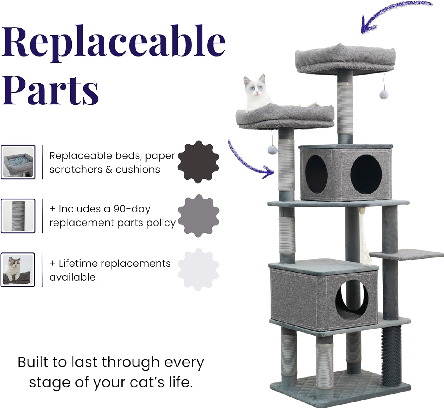 Catry® Stella 7-Level 67.5” Linen & Quilted Velvet Cat Tree with Recycled Paper Scratchers, Two Condos, Removable Beds, Toys, Easy to Clean, Ideal for Large Cats and Multi-Cat Homes (Zinc Gray)