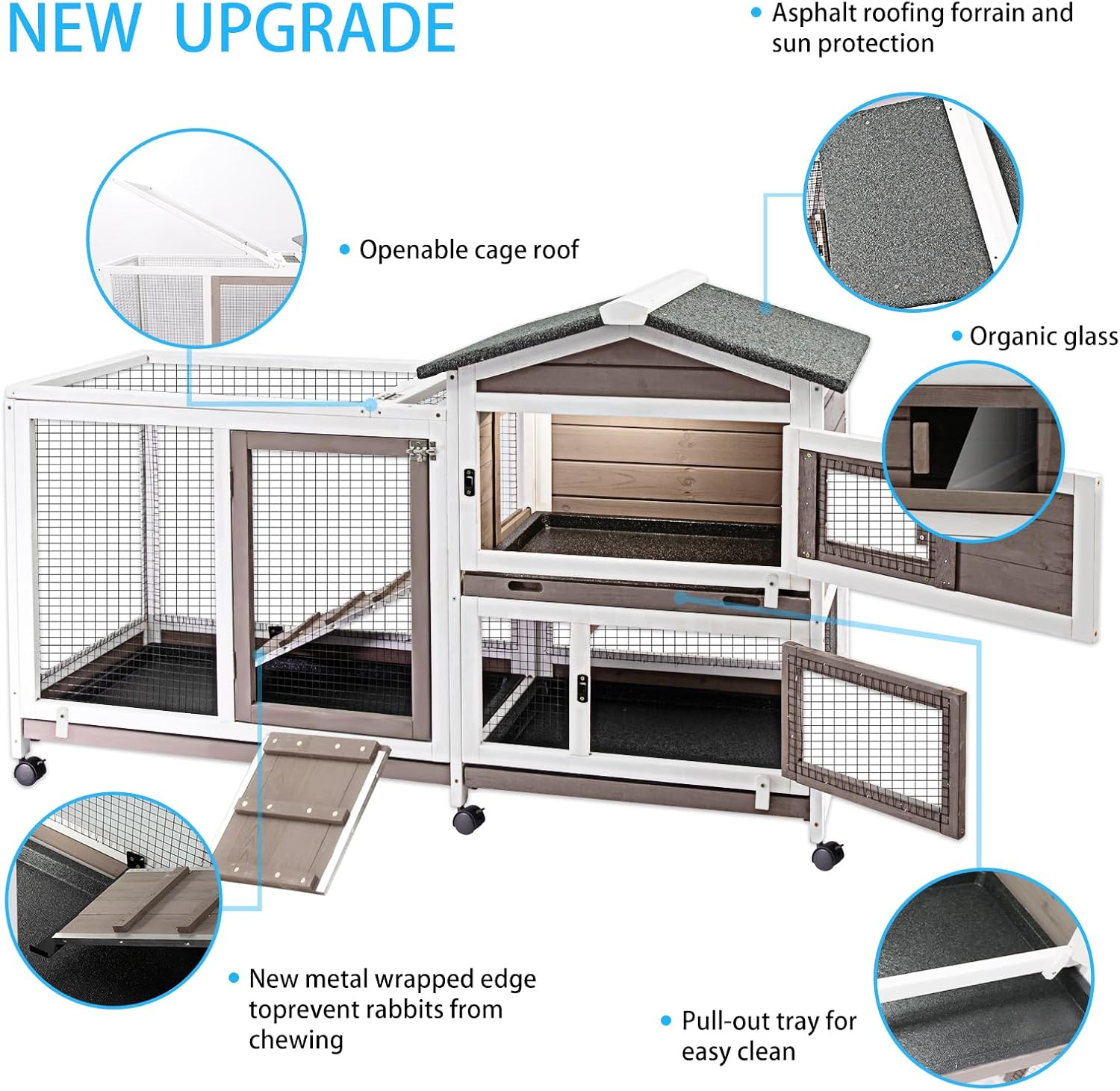- 【Humanity Design】The 3 removable trays of the rabbit cage indoor make the guinea pig condo easier to clean which will not leak. The bunny hutch have 6 wheels which are convinient to move. You can easily to retrieve your pets from the cage as the top of the activity area is openable,which is also sinple for you to feed them.