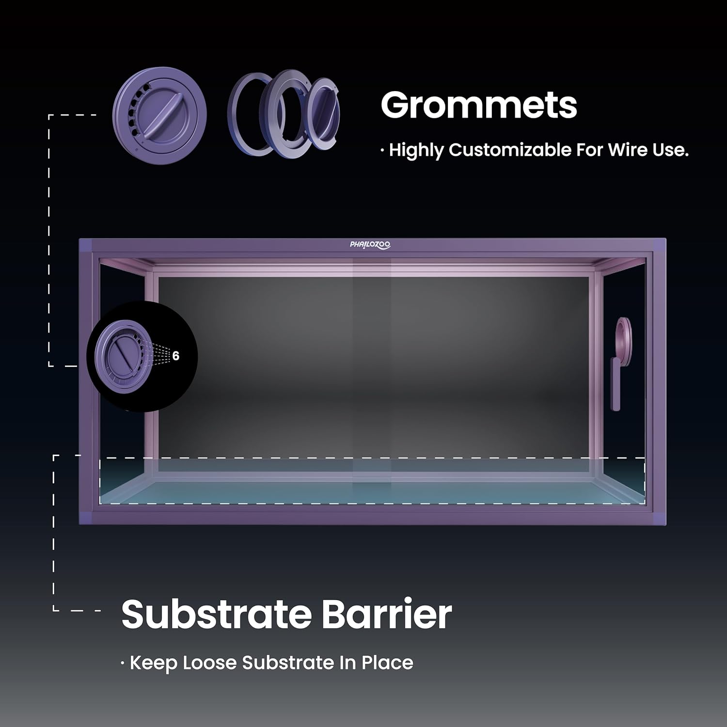 - ăEasy MaintenanceăFront opening reptile terrarium with door handles included for easy cleaning & feeding. No more suction cup problems or unsightly fingerprints all over. The substrate barrier keeps the substrate in place. Our tempered glass doors are durable enough to withstand scratching.
