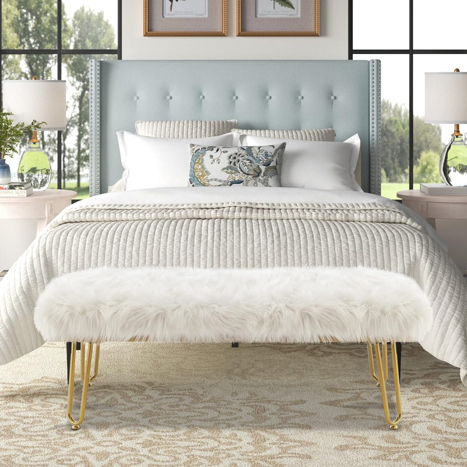 42.5Inch White Bedroom Bench, Benches for Bedroom White Faux Fur Upholstered Bed end Bench, Tufting Bench Indoor Bench with Metal Legs for Living Room Bedroom Dining Room Entryway