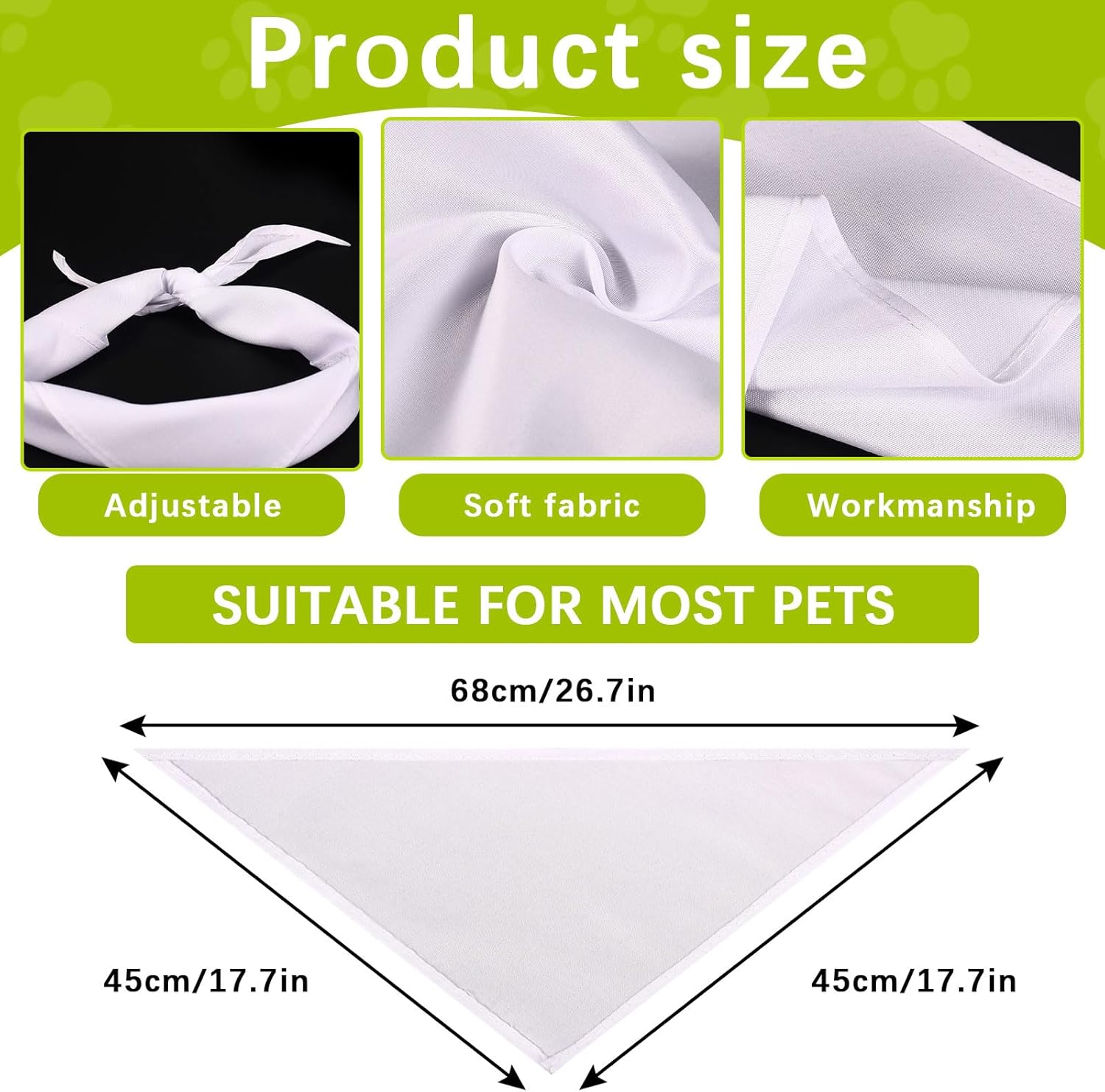 - 【Package Contents】30 PCS white dog bandana, product size: 17.7 x 17.7 x 26.7 inches / 45 x 45 x 68 cm, suitable for most small, medium or large dogs; Please measure your pet and leave room to tie the knot.