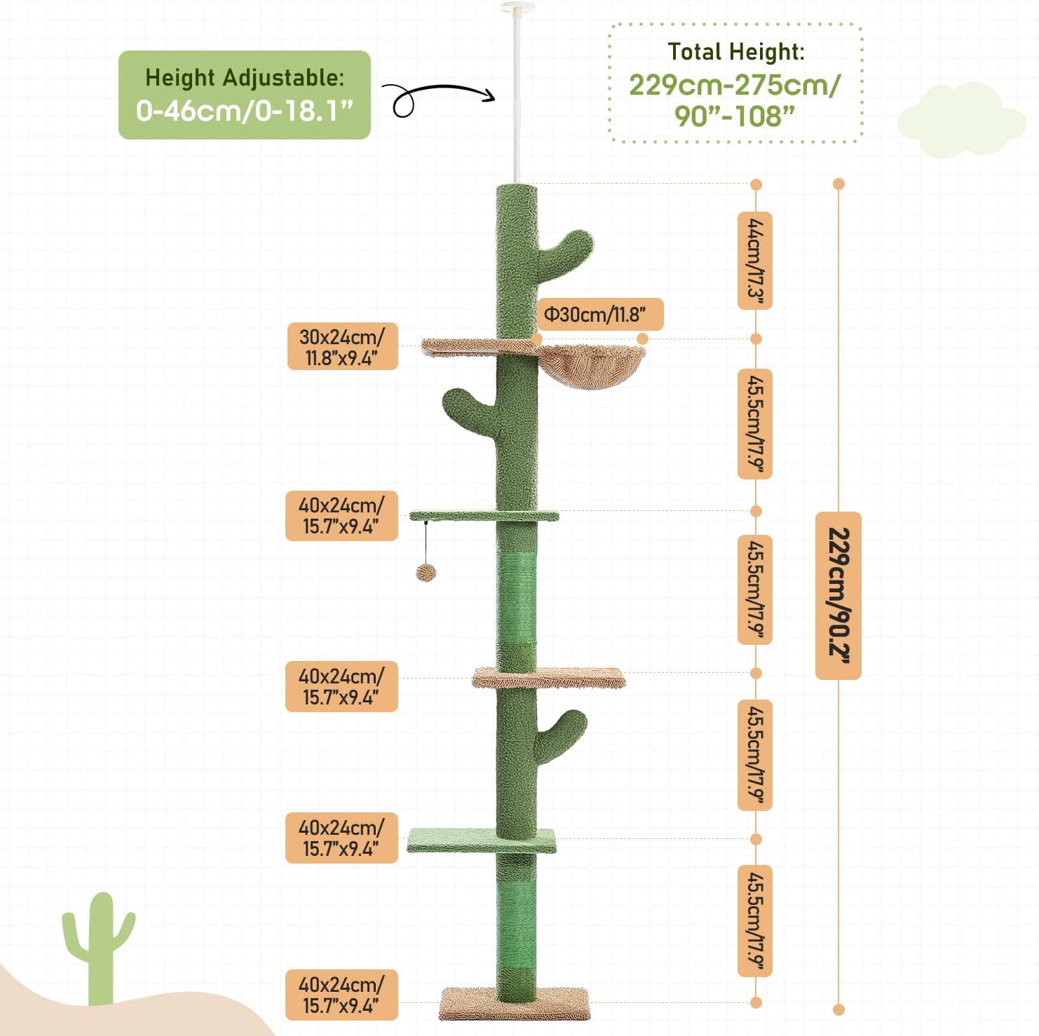 - Unique Cactus Shape: This floor to ceiling cat tower with color-saturated look, which suitable for average cats will be sure to grab full attention of your cat and also perfectly fresh your living room. Also, this multi-functional tall cat tree combines five platforms, one hammock, dangling balls and fully sisal-covered scratching post to meet indoor catâs various needs.
