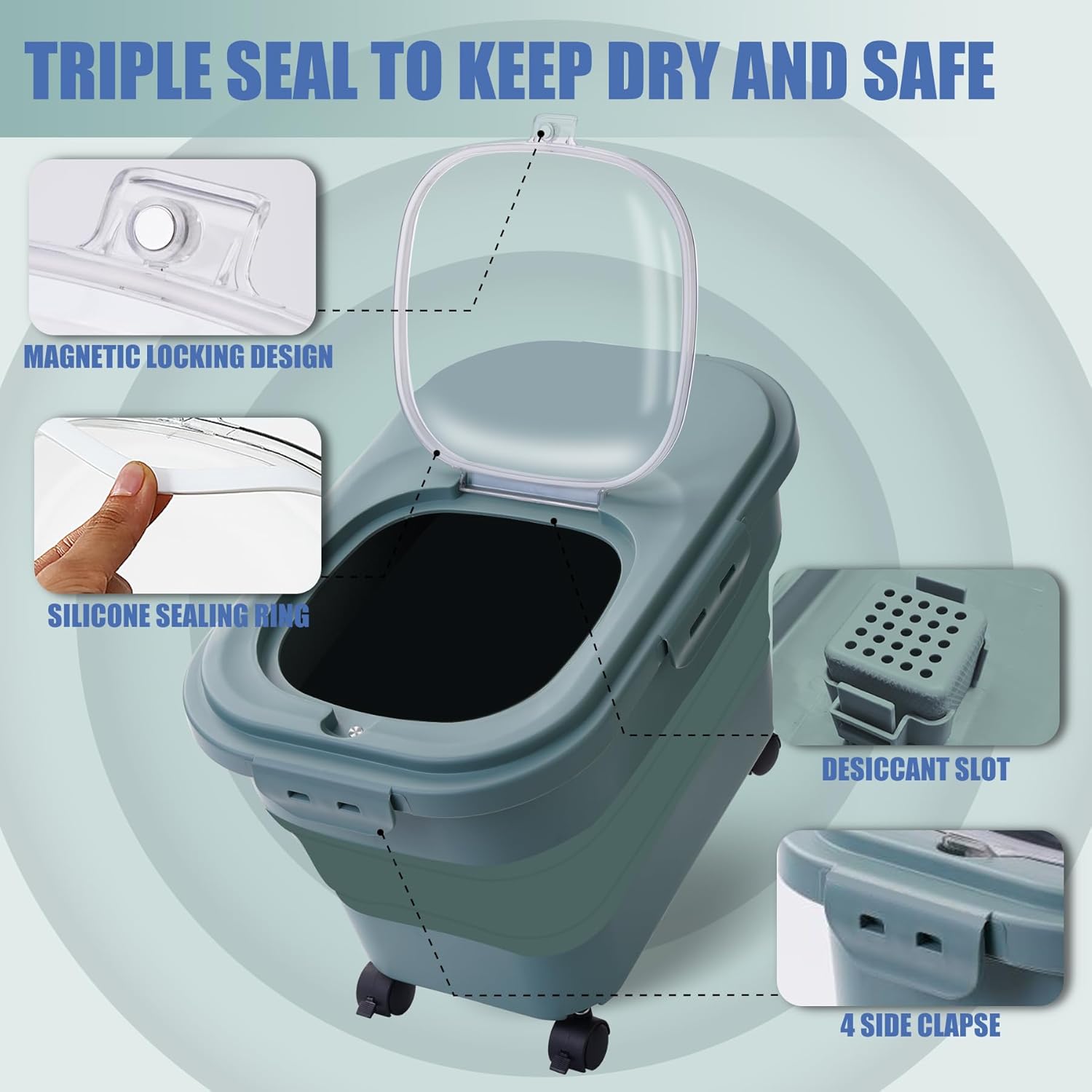 - đśăRemovable WheelsăAre you tired of struggling with the unwieldy weight of heavy pet food bags? Our dog food containers are carefully designed with four detachable wheels. Imagine being able to effortlessly slide your pet's food container through different rooms in your house, or take it outdoors for a picnic with your beloved furry friend. It was a wonderful feeling!