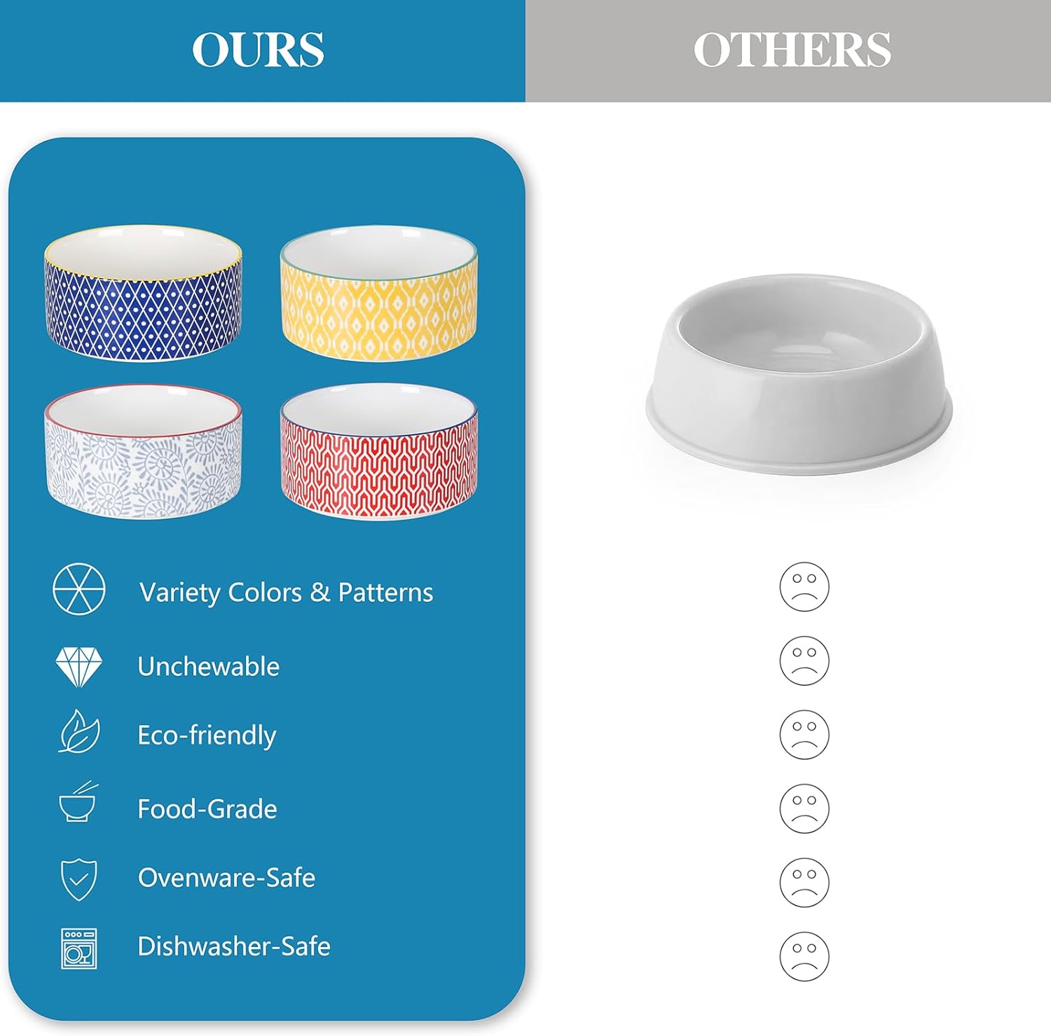 - HEALTHY STURDY CERAMIC MATERIAL - Our dog food dishes are made of premium ceramic material, which has no harmful lead & cadmium, odorless, sturdy, and healthy for your furry friends. And the ceramic pet bowl helps your dog away from chin disease. Its smooth glaze finish makes it wash by hand or dishwasher easily. You can also heat the food in the microwave for your pets at any time.
