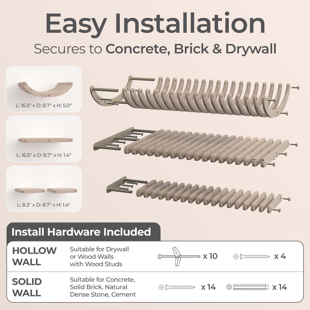 - Effortless Paradise: This cat playground includes all installation hardware, allowing your fur-baby to start exploring right away. Our cat climbing shelves securely attach to concrete, cement, brick, dry wall and more ensuring your catâs safety.