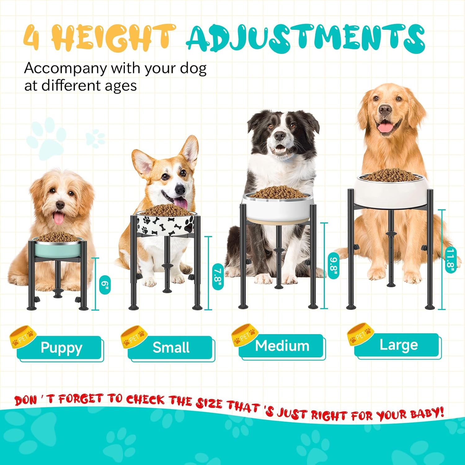 - Height & Width Adjustable Design: This elevated dog food bowl stand will accompany with your dog at different ages, with 4 adjustable heights(8â/10â/12â/13.8â),adjusted in width 6-10â, ensuring that your dog eats in a healthy and safe way at all times; Every time the height of the dog food bowl stand increases it means that the dog has grown a little bit more with you, what an unforgettable moment