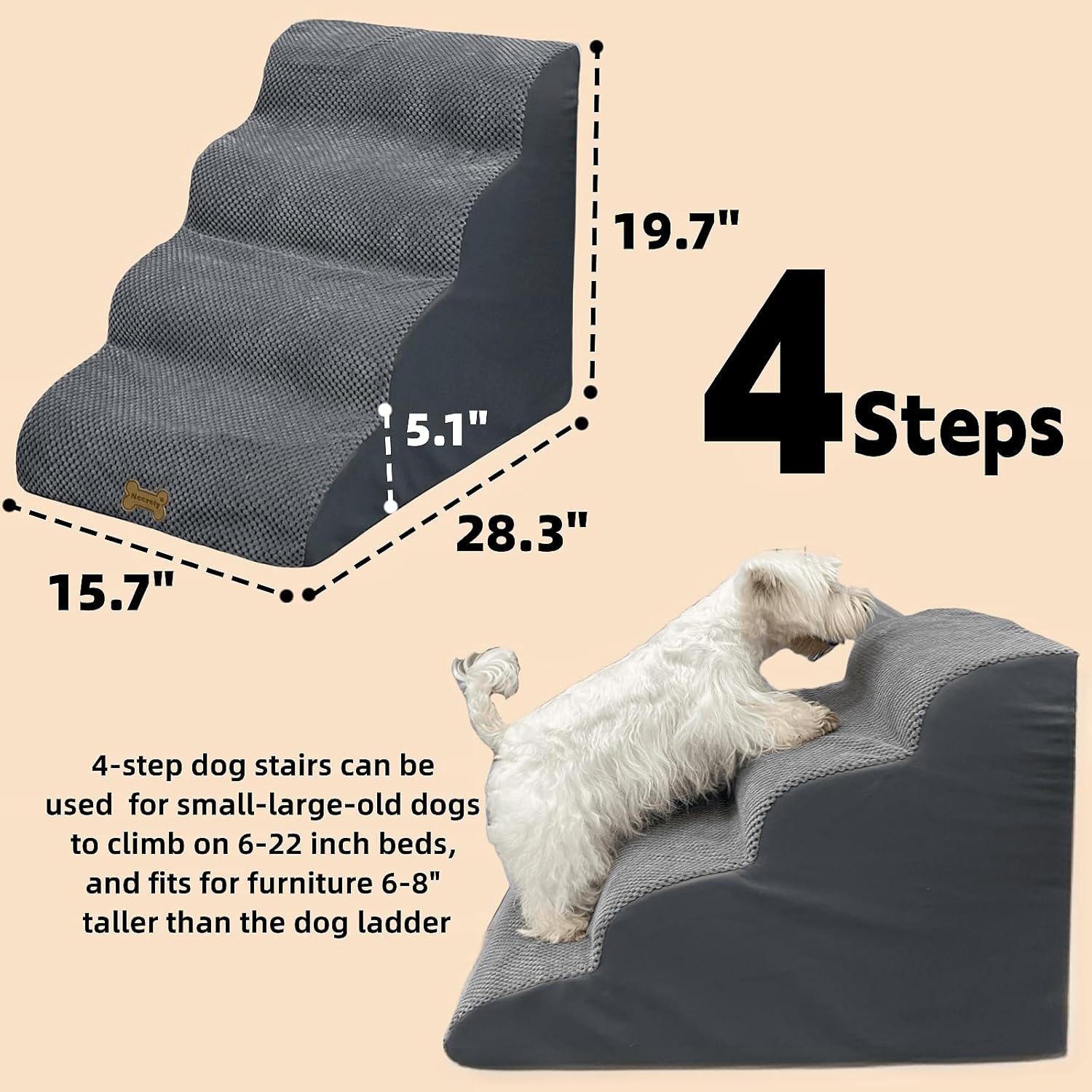- 【Multi-size dog steps for different dog】: Dog Pet Stairs has 2, 3, 4 and 5 steps for small & large dogs to choose from and is suitable for most /high beds/couch/chairs/sofa such as 6"/11"/13"/15"/17"/19"/20"/22"/24"/27"/30 inches, each step height is 5-6 inches. The 15.8 inch width is more stable, the 4/5 step dog staircase is compatible with 2/3 of the height of the dog stairs used by puppies Ideal for older dogs, small dogs or dogs with limited mobility