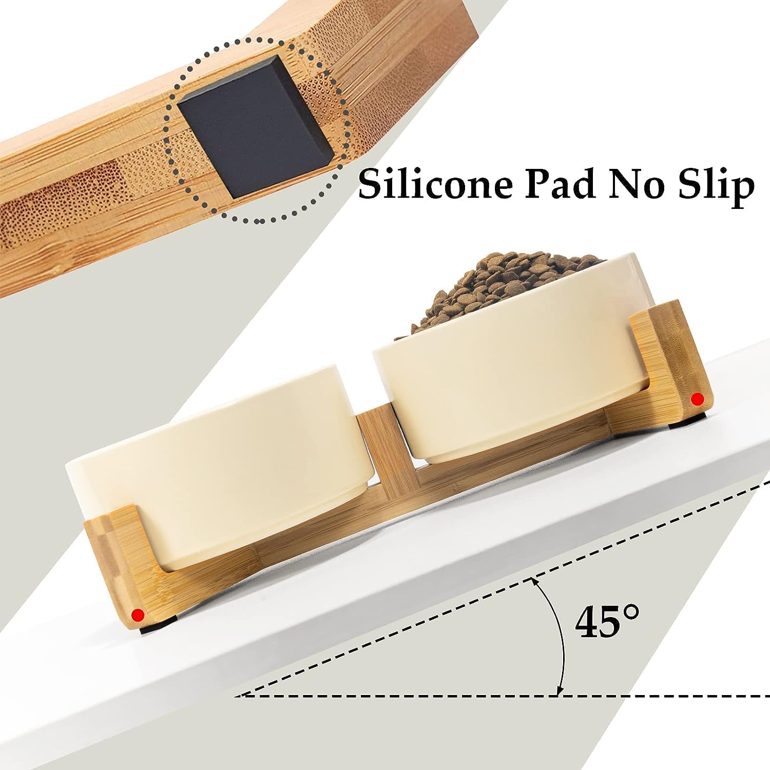- [Double Bowl Design]:One dog bowl for food and one for water, Each ceramic cat bowl has a Unique wooden stand, raising the dishes closer to your pet for more comfortable eating