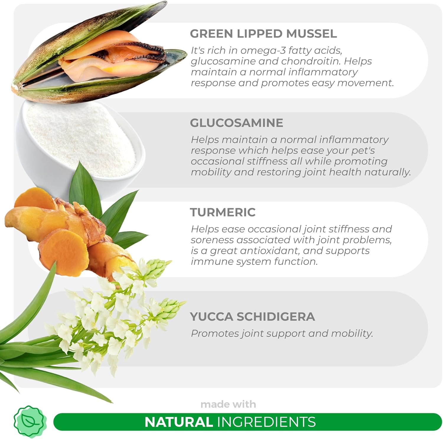 - Natural Antioxidant Blend: Featuring Turmeric and Yucca Schidigera, our formula not only promotes joint support but also aids in maintaining a normal inflammatory response, all while providing a potent antioxidant boost for your dog's well-being.