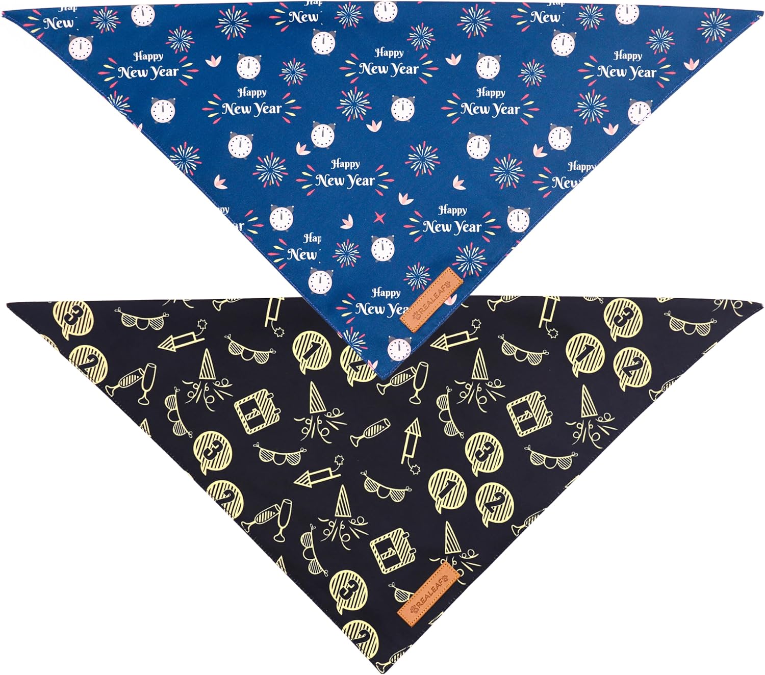 Realeaf Happy New Year Dog Bandanas 2 Pack, Reversible Holiday Pet Scarf for Boy and Girl, Premium Durable Fabric, Bandana for Small Medium Large and XLarge Dogs (Large)