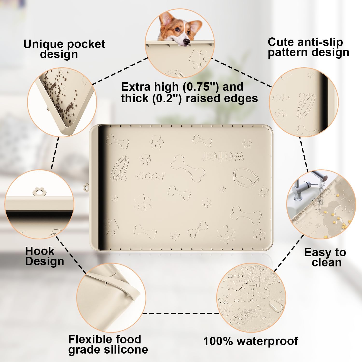 - đžăSuper High & Thick Edgesă: Pet feeding mats with 0.75"raised edge can effectively collect food and water from mat and avoid them spill over the edge,and keep the floor clean and tidy,no clutter;The 0.2 inch thickened edge makes the mat less likely to bend or be torn up by pets,giving you a long-lasting and durable pet bowl mat.