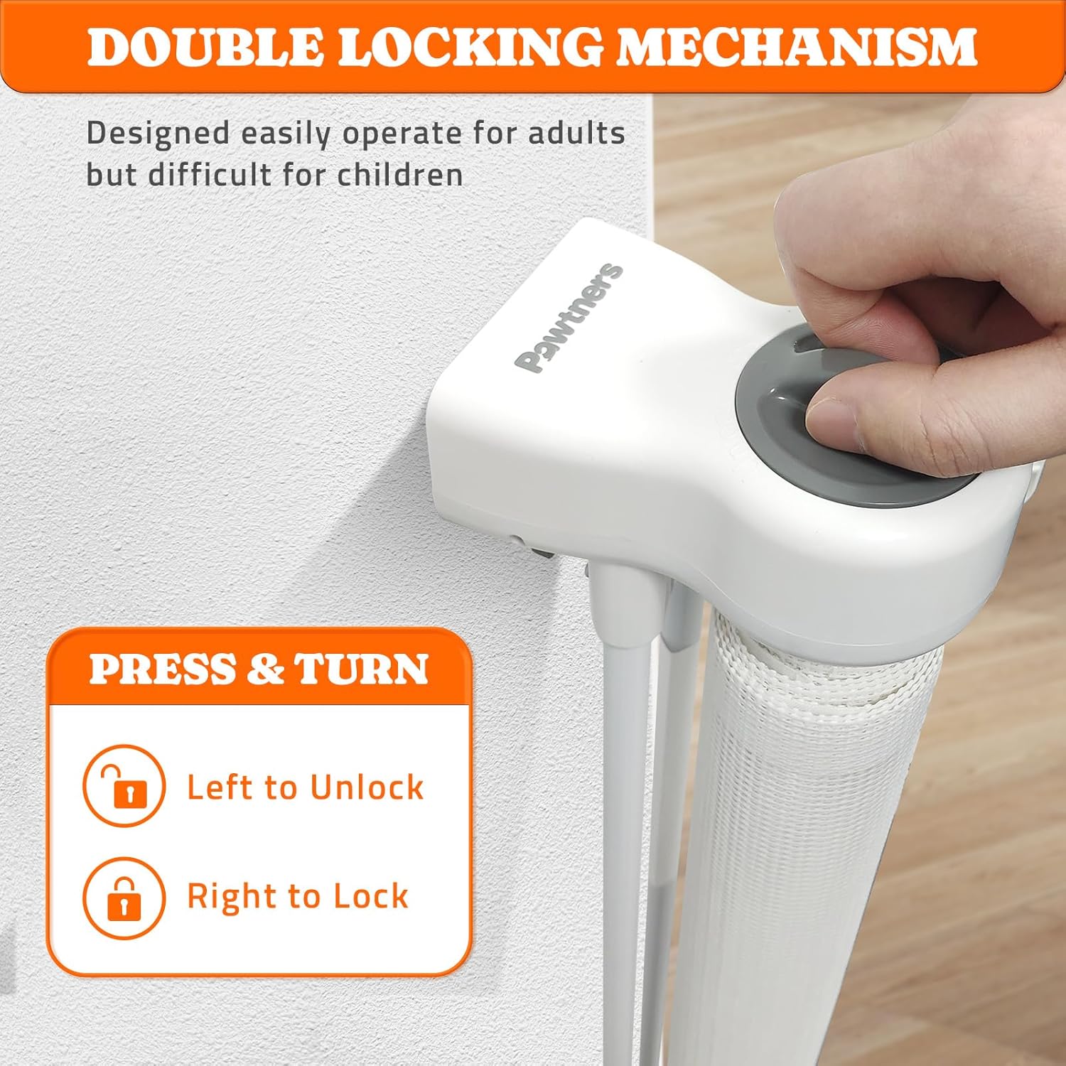 - Double Locking Mechanism: The knob (Press & Turn Design) at the top of the baby gate, especially the tall baby gate, ensures easy use for adultsâopen and close with one hand. Meanwhile, curious little ones won't be able to unlock this secure safety gate