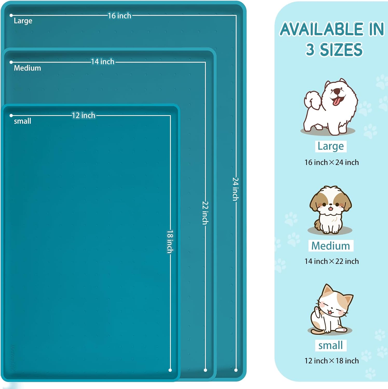 - Anti-Slip & 100% Waterproof: Featured a non-spill silicone surface with raised dots, the dog eating mat and silicone dog mats for food and water bowls are helpful for keeping your pet's bowl in place to allow your furry companion to dine in peace. Our dog water bowl mat for messy drinkers and dog feeding mats for food and water are constructed from 100% waterproof silicone so that water or messy food can be contained to the topside of dog placemats for food and water and far away from your floor