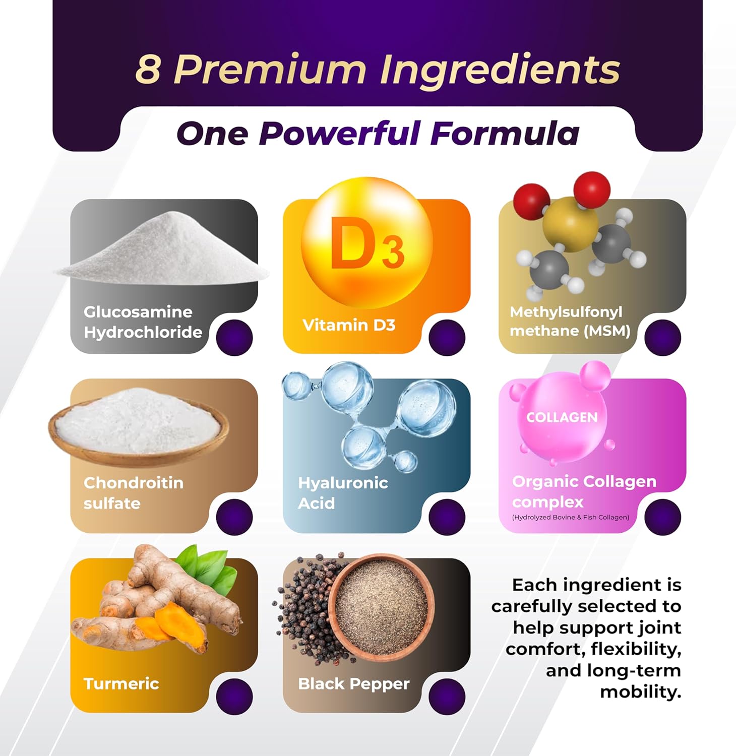 - Unrivaled Formula: GriMed Glucosamine presents a unique combination of 8 precious herbs neatly packed into every capsule. These ingredients encompass Vitamin D3, Glucosamine Hydrochloride, Methylsulfonylmethane, Chondroitin, Hyaluronic Acid, Organic Collagen complex, Turmeric, and Black Pepper. This special blend significantly elevates your overall well-being. No need to manage various supplements anymore â a single daily Grimed Glucosamine capsule delivers remarkable outcomes.