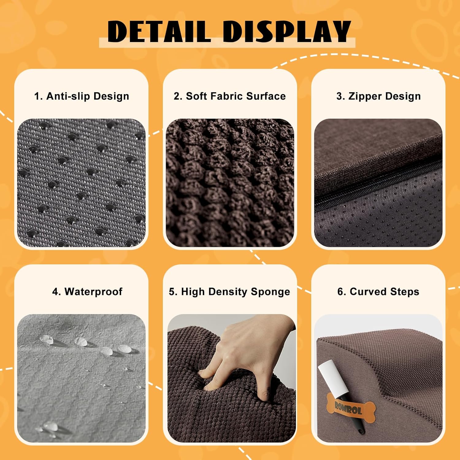 High Density Foam Dog Stairs Ramp for Beds Couches, Romrol Pet Steps with Durable Non-Slip Waterproof Fabric Cover, Dog Slope Stairs Friendly to Small Dogs and Cats or Pets Joints, 2-Tiers