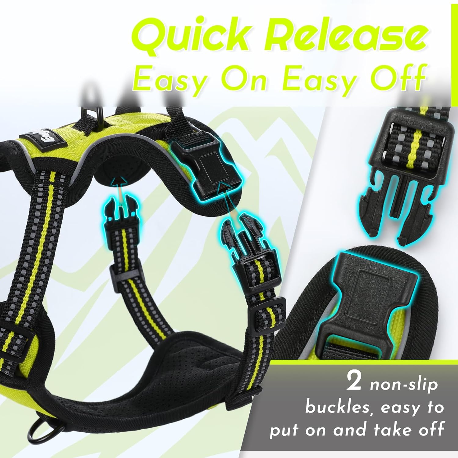 - Easy to Use: Our dog harness is designed with 2 quick-snap buckles for simple wearing and 4 adjustable sliders at the neck and chest for a perfect fit. Just slip it over your dog's head, buckle it up, adjust the straps, and you're ready to go in seconds