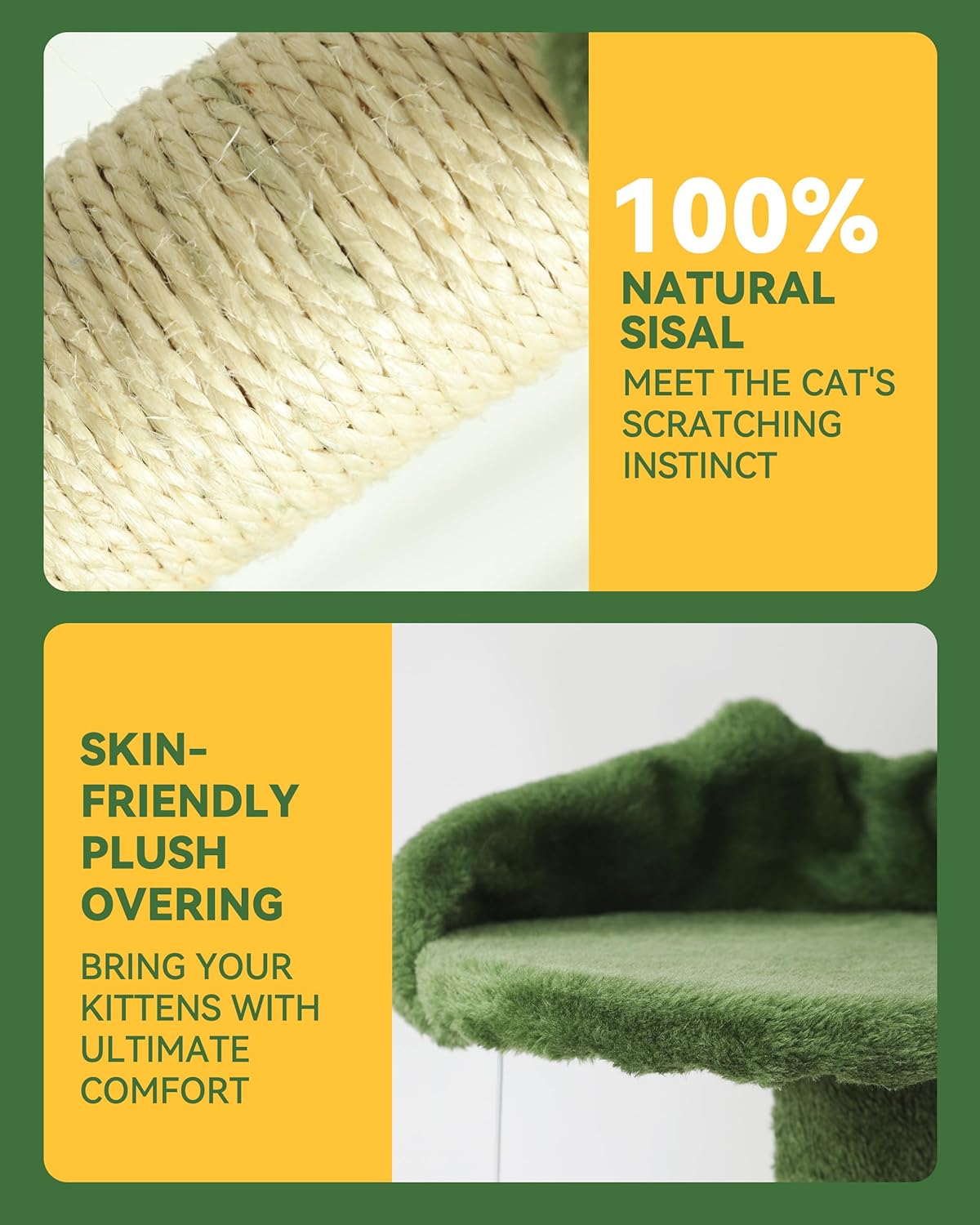- Nature-Inspired Design: Our cat tree is adorned with verdant green plush and apricot sisal scratching posts, elegantly intertwining these two refreshing and natural hues into a seamless whole. Even indoors, the tranquil ambiance crafted by the cat tree evokes the sensation of being in the midst of nature