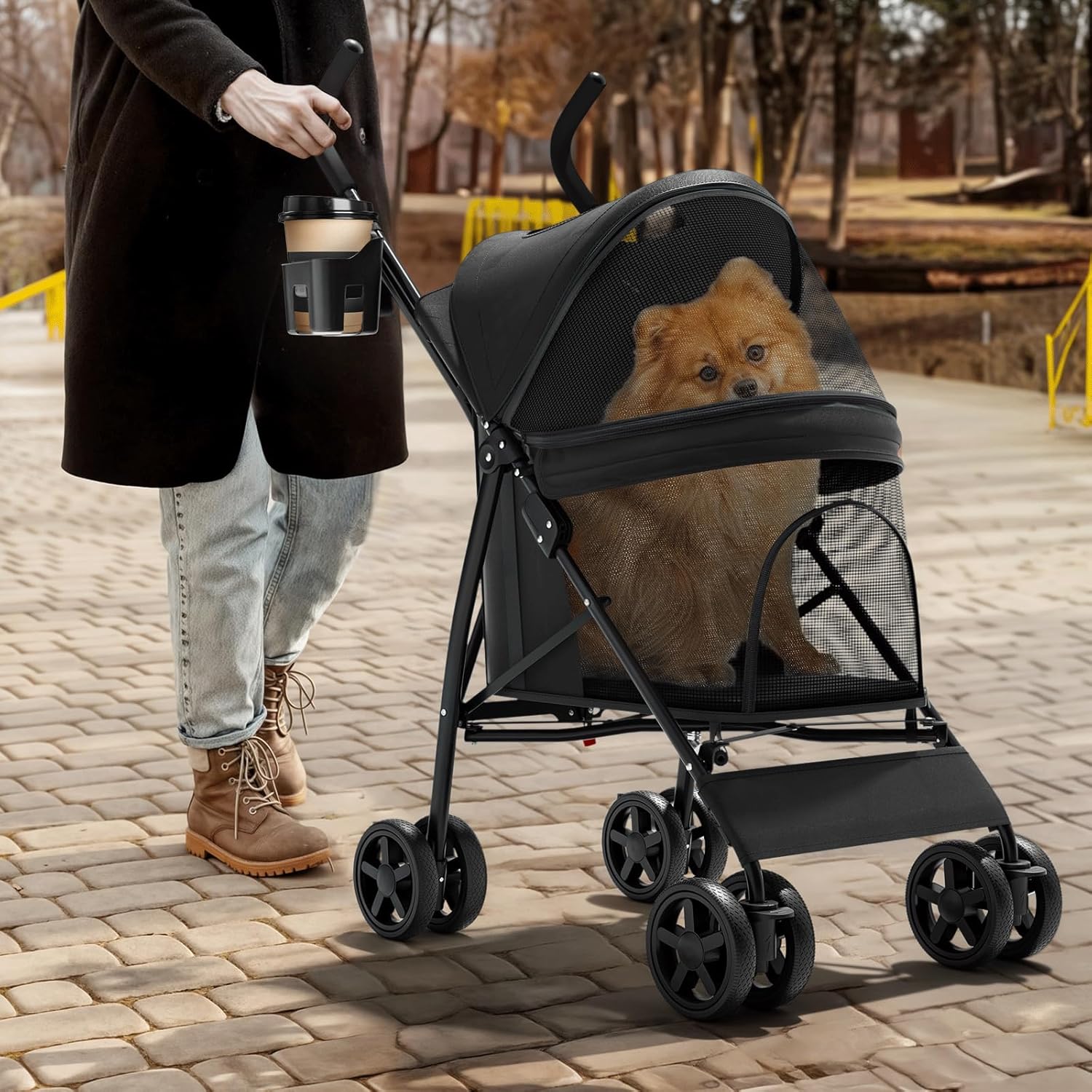 Magshion Compact Pet Stroller for Small-Medium Dogs/Cats up to 22lbs, 4-Wheel Lightweight Umbrella Shaped Portable Puppy Travel Jogger with Breathable Mesh, Cup Holder & Rear Storage, Black