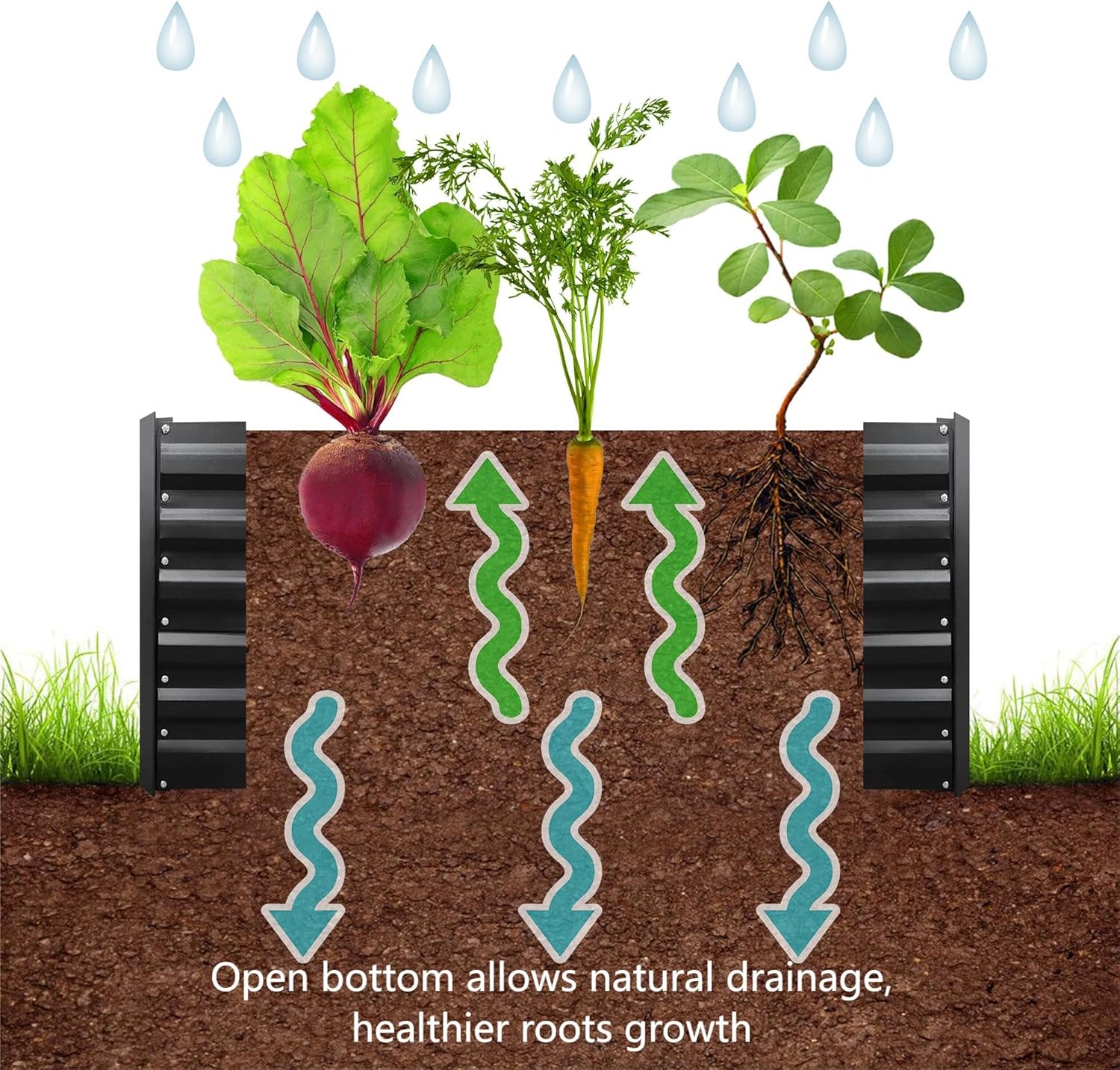 - OPEN BOTTOM: Sits on the ground garden bed, allows natural drainage, prevent waterlogging and root rot. It encourages the plantsâ roots to grow deep into the ground, promoting stronger and healthier plants.