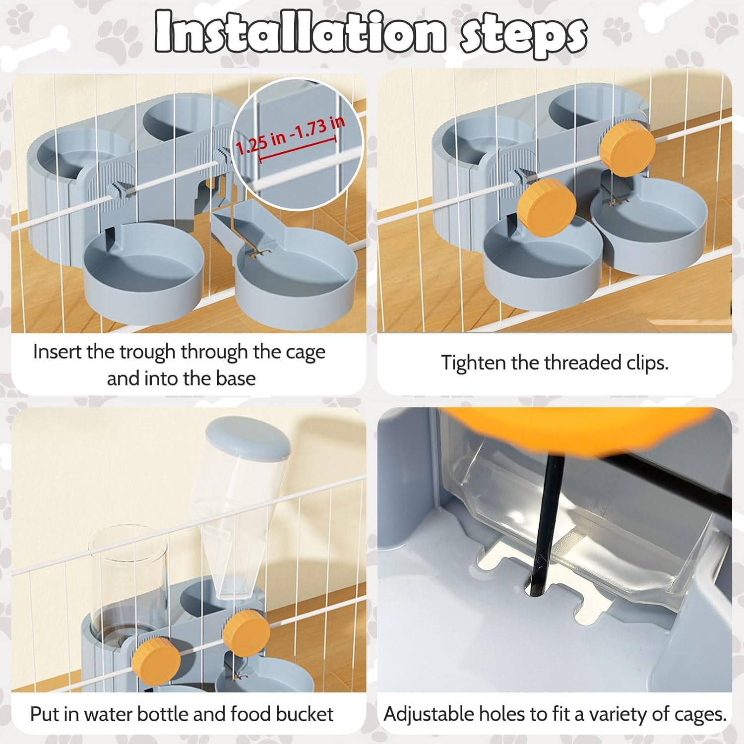 - Tip : The bunny water dispenser is suitable for cages with wire clearance of 3.2 cm (1.25 inches) - 4.4 cm (1.73 inches), please measure the wire clearance carefully before purchasing to ensure that the pet feeder can be installed and used properly