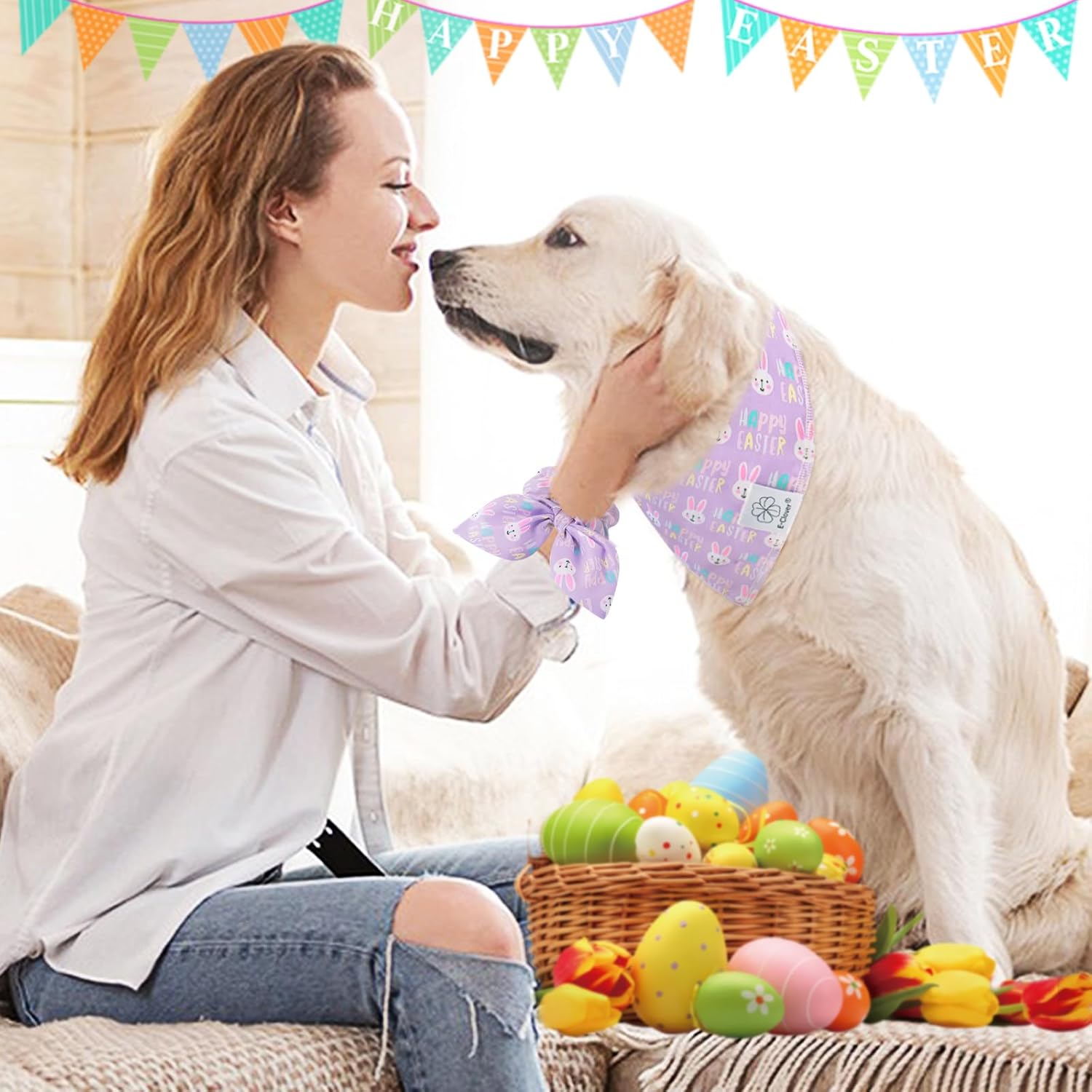 - Matching Dog and Owner Clothes- Itâs so cute and unique, dog mom and dogs are wearing the matching costume together. When traveling, daily walking, or taking photos, adorable dog bandana matching scrunchie is both funny and personalized dog accessories. The scrunchie can be worn as a wrist accessory, or as a ponytail holder hair band. Beautiful happy easter dog bandana matching pet set is nice spring themed photo props.