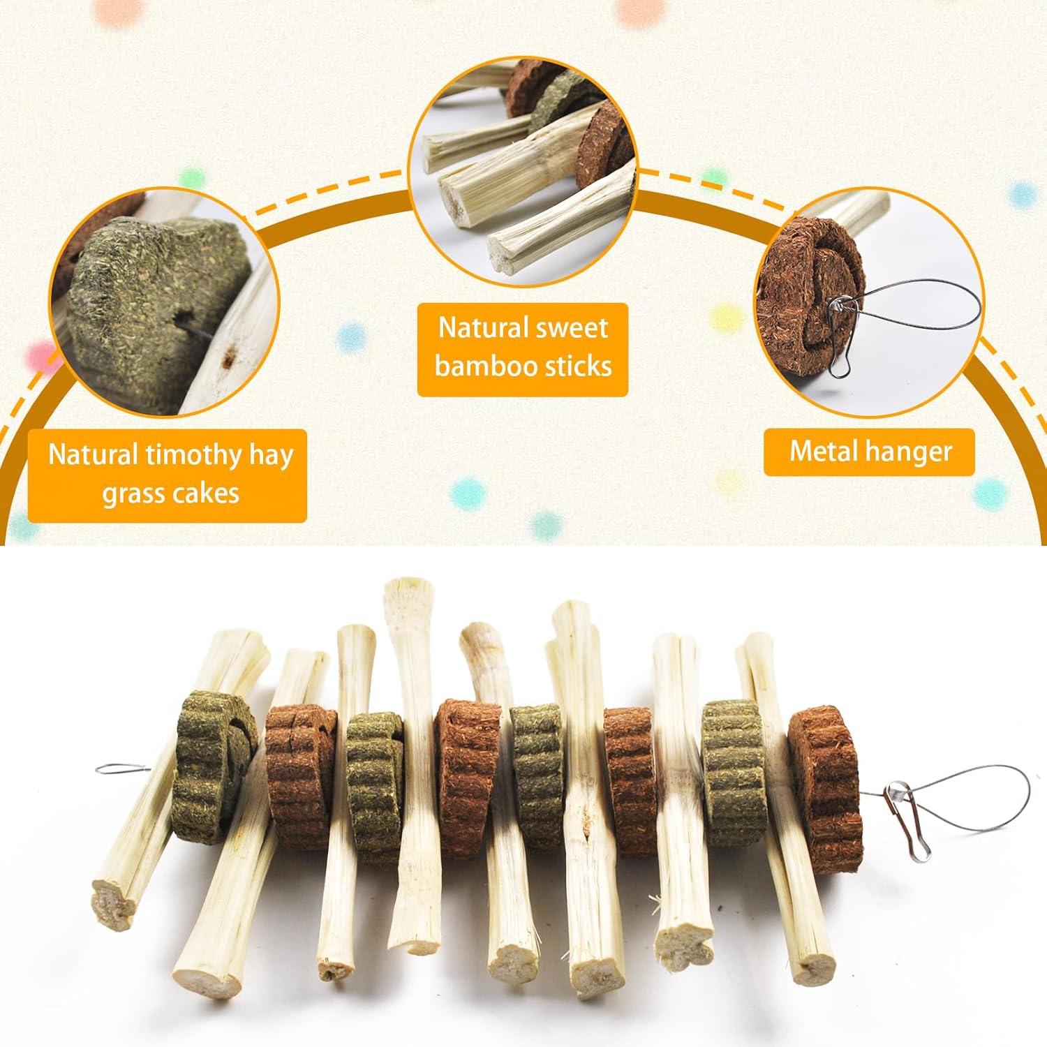 - 【Natural Snacks】Bunny chew toys for teeth grinding include sweet bamboo sticks, timothy hay cakes and carrot cakes. bunny chew toys for rabbits can be used as a balanced and healthy snack for them.