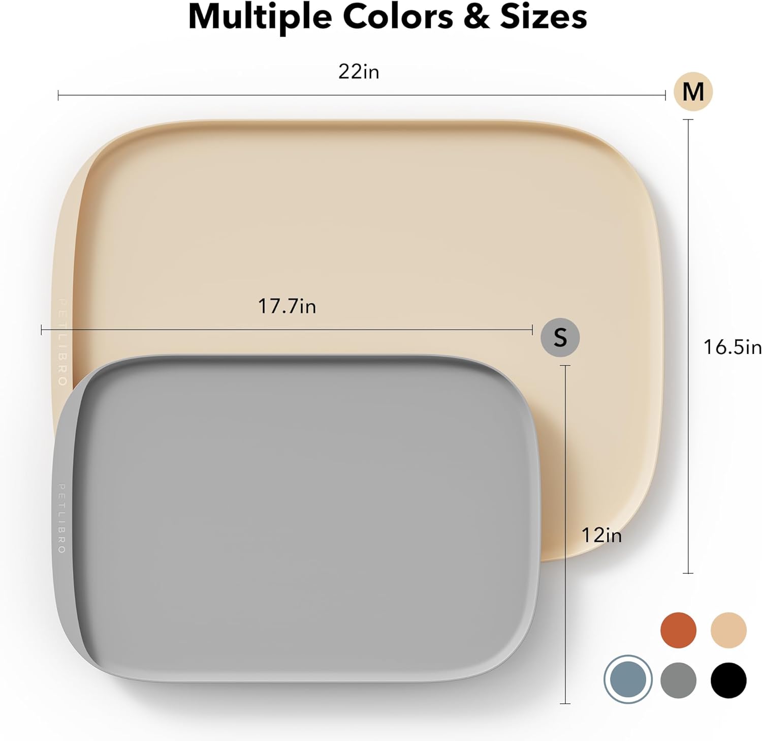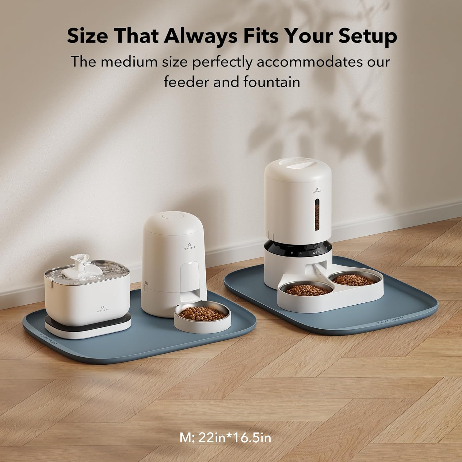 - A Perfect Fit For Every Pet And Bowl: With a range of sizes and colors to choose from, the Cove food mat is a versatile addition to any pet feeding station. The small mat measures 17.7 Ă 12 in, while the medium option measures 22 Ă 16.5 in. Not only do they fit perfectly with the PETLIBRO range of smart feeders and fountains, but they're compatible with various bowls and accessories too.