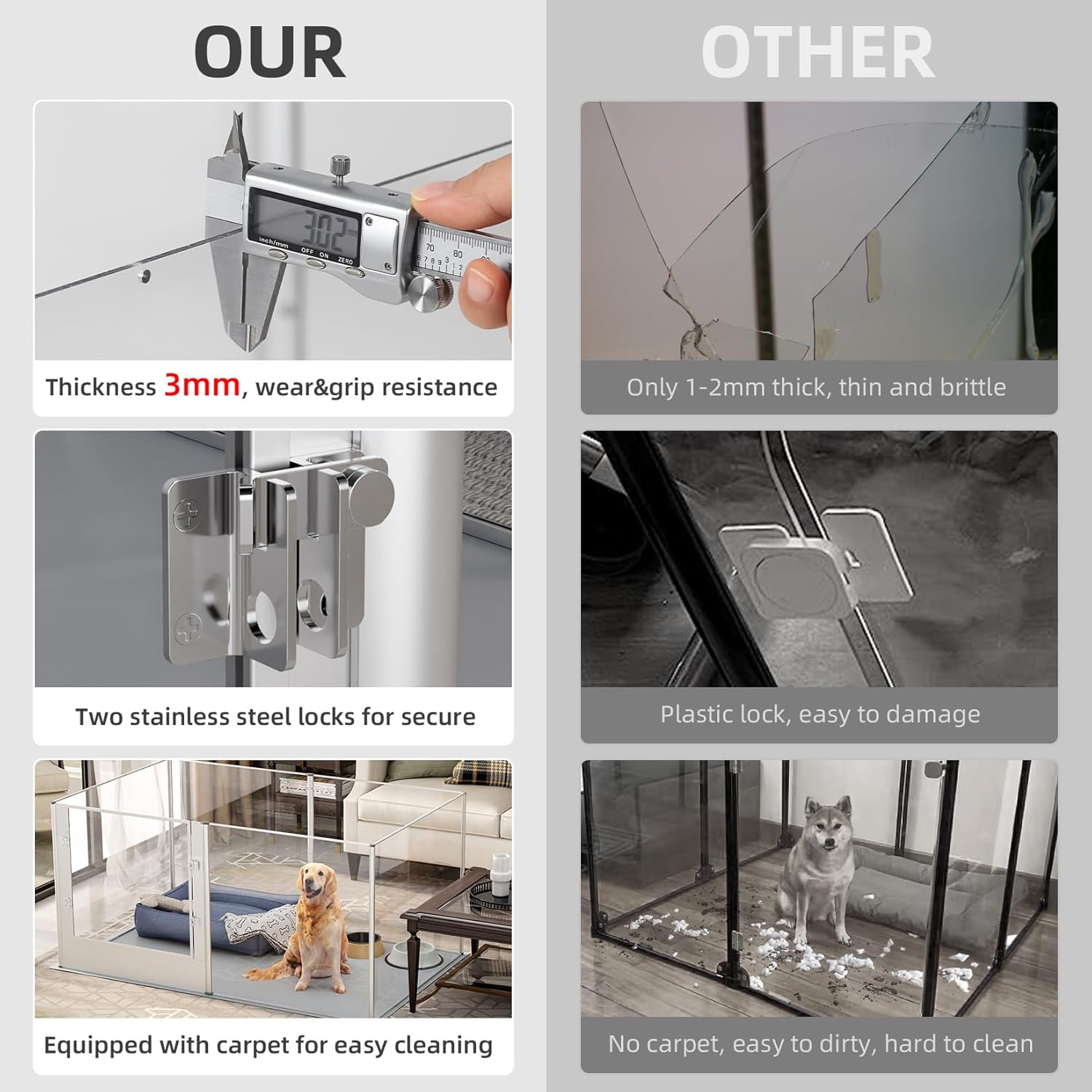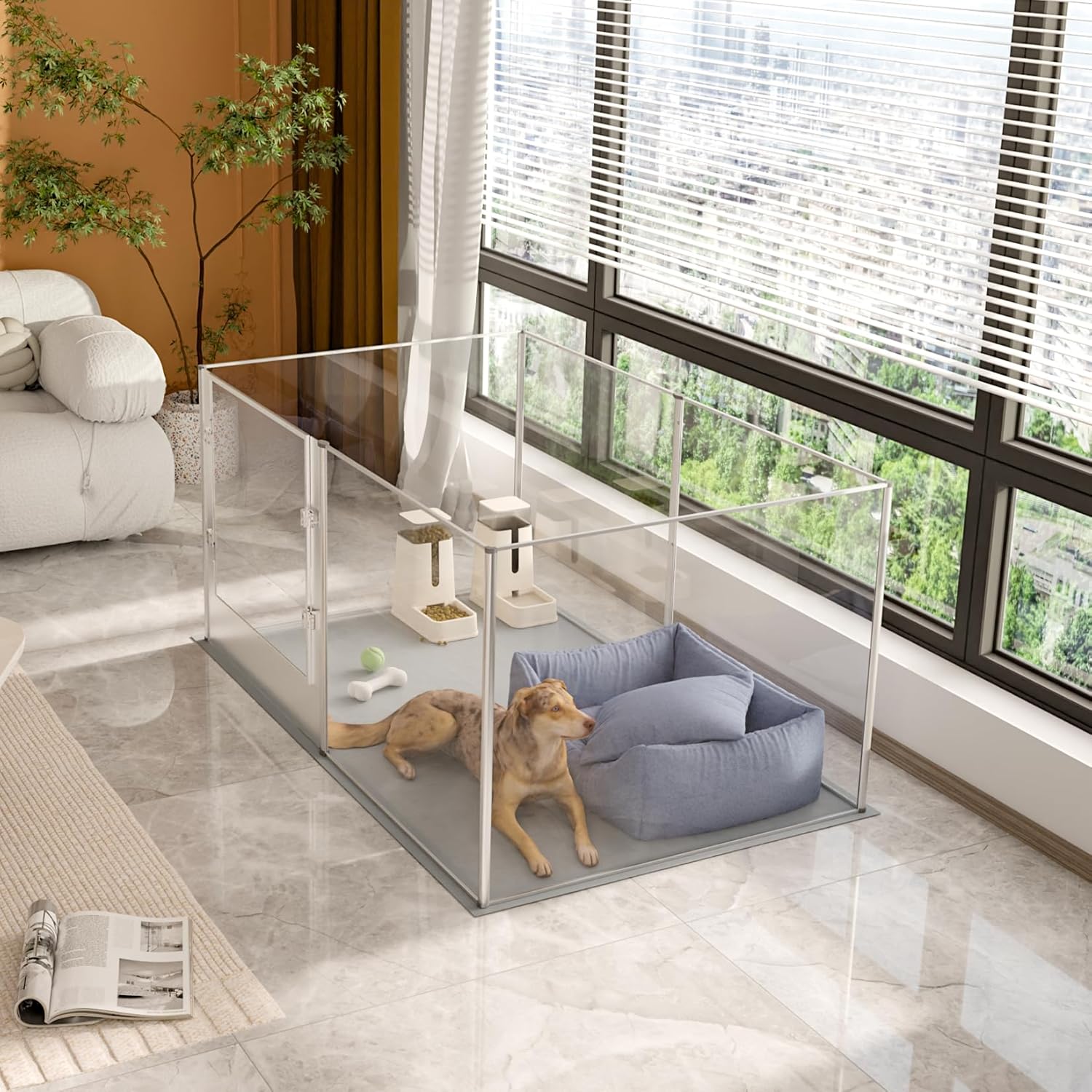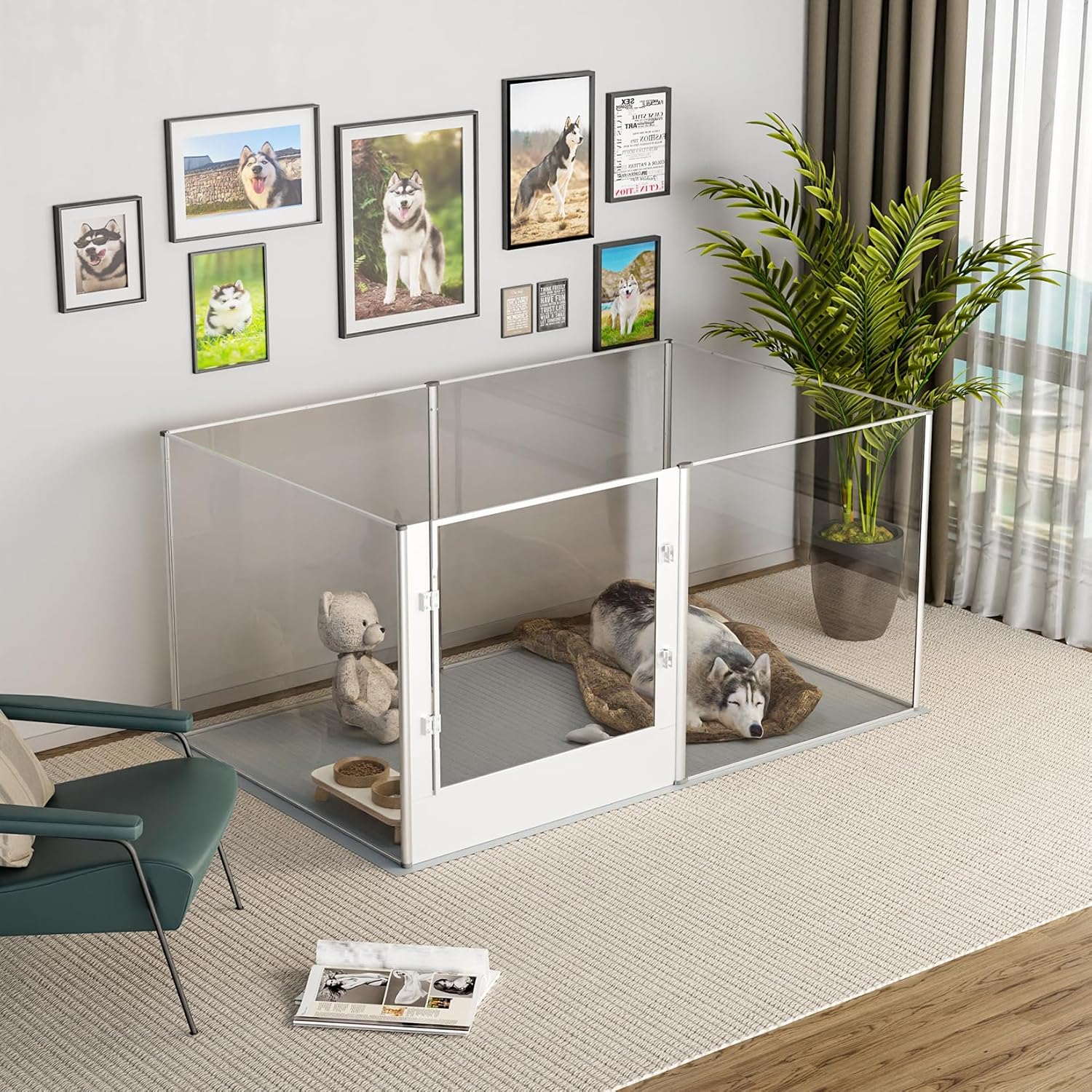 - Clear Acrylic Fence Design - Crystal-clear acrylic dog fence playpen enables you can interact with your pets closely, 360° high transparency and wide vision, itâll relieve your pets from anxiety, they also make sure you are by their side, equipped with a door for dog mom/ pets to come and go easily, so this is a unique gift for your loved friends, get this fence in the room, instantly improve the overall interiors