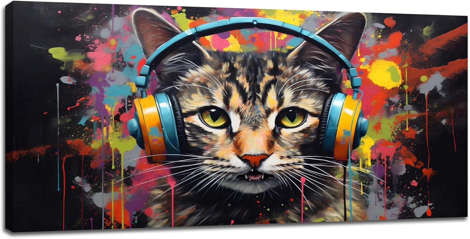 Large Banksy Cat Wall Art Colorful Graffiti Canvas Living Room Pictures Framed Prints Street Pop Modern Wall Decor Painting Artwork for Bedroom Dining Office Home 60"x30"