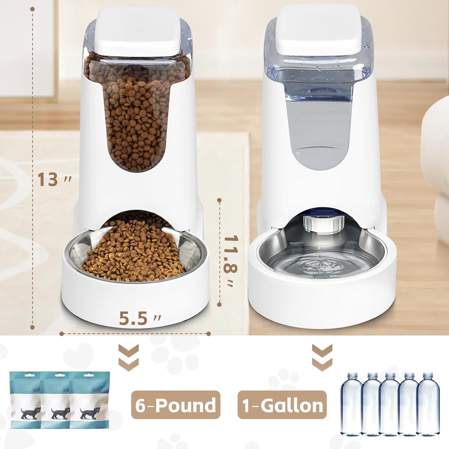 Automatic Cat Feeder and Water Dispenser with Stainless Steel Bowl Dog Gravity Food Feeder and Waterer for Small Medium Pets Puppy Kitten 1 Gallon x 2
