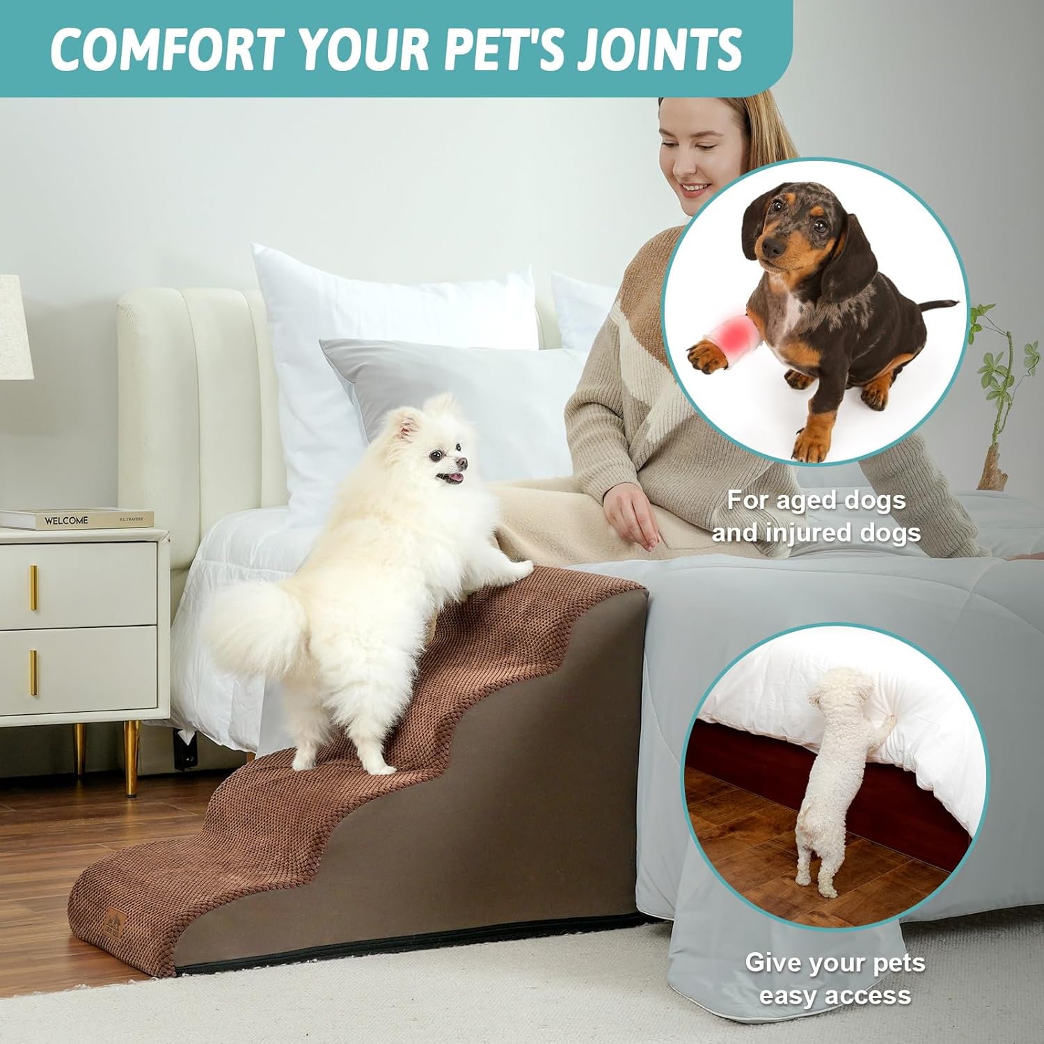 Dog Stairs for Small Dogs 19.7" H, Curved Dog Step for Puppy, Older or Cat, Medium Pet Ramp for Sofa, Couch or Bed, Ladder with High Density Foam, 15.7x28.3x19.7 inch, 4 Step, Brown