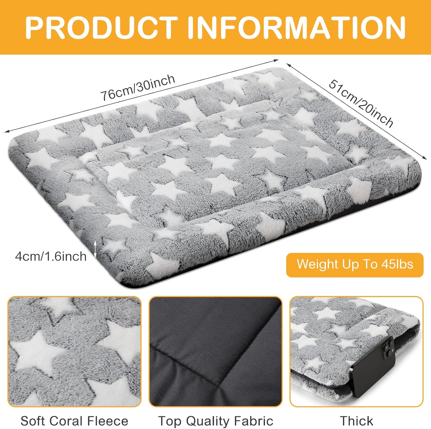 - Stylish Design: the dog crate mat is made of quality coral velvet and linen cotton materials, with nice craftsmanship; This stylish dog bed mattress features a traditional rectangle open mat design that provides pets plenty of room to sleep; Comfortable surface can match up with the furniture easily and has good breathability; The cute star surface can play a decorative role, making the dog crate more beautiful and lovely