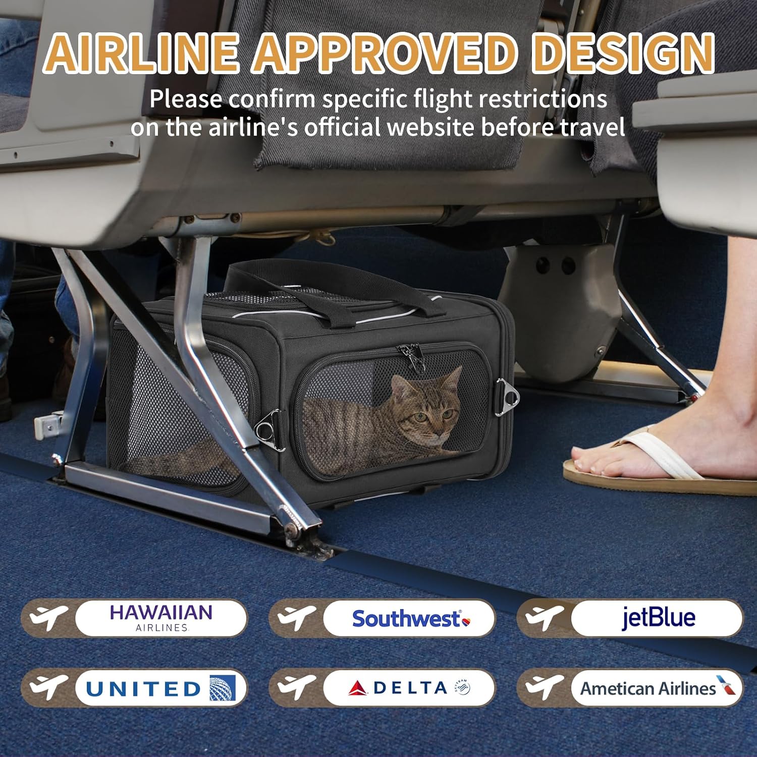 - Airline Approved: This airline approved cat carrier features detachable, washable soft pads on both sides for versatile placement (standing or lying) to adapt to different cabin seat heights. The cat carrier is compatible with most airlines, including Alaska Airlines (17x11x9.5 "), Southwest Airlines (18.5x13.5x9.5 "), Delta Airlines (18x11x11"), United Airlines (18x11x11"). If traveling with other airlines, please verify luggage size requirements on their official website before purchasing