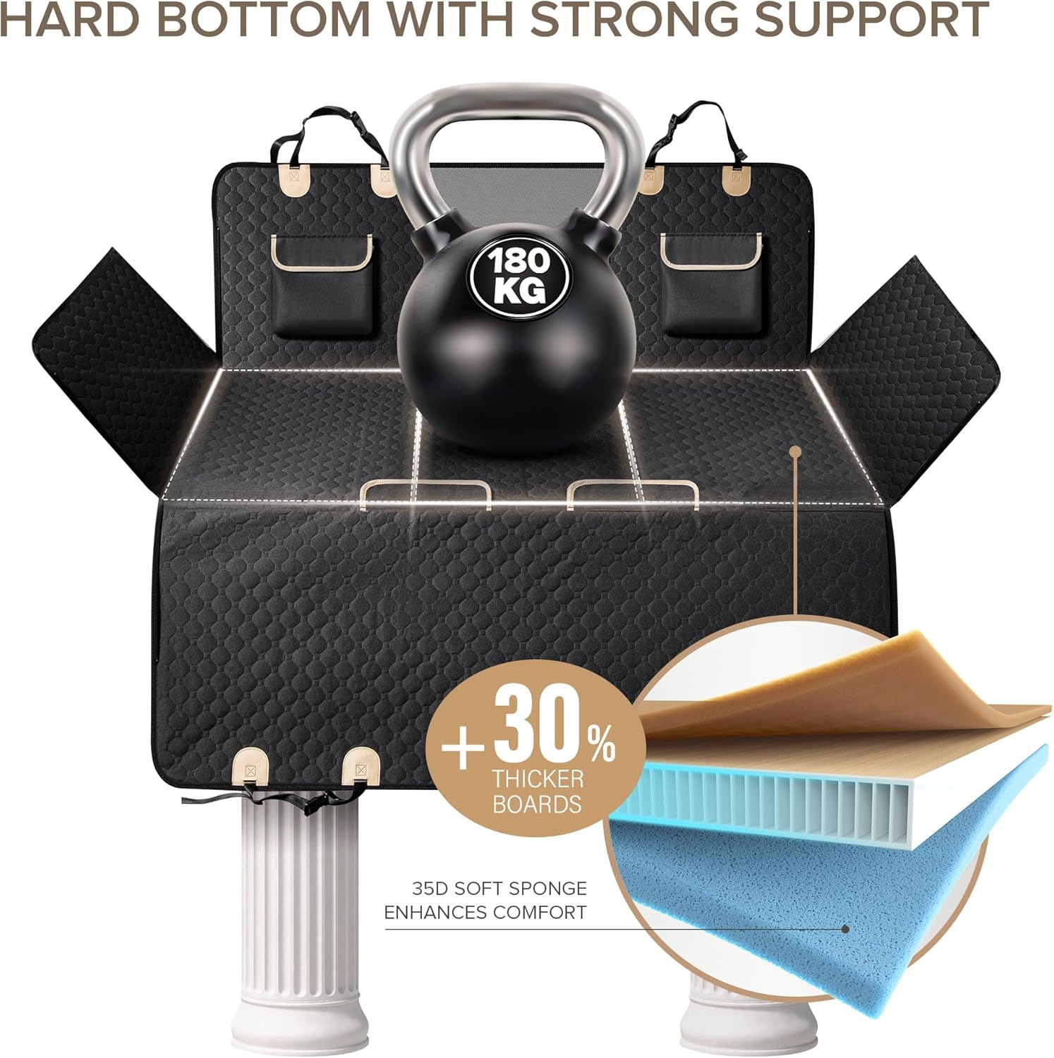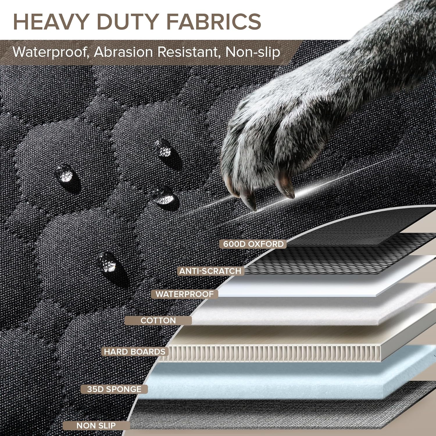 - 7-LAYER MATERIALS FOR STRONG SUPPORT, PROTECT AND COMFORT - Constructed with heavy duty materials including 600D scratch-resistant Oxford, waterproof fabric, thickened hard bottom boards, 35D soft sponge and cotton layers for added comfort and non-slip fabric that wouldnât slide. Pet seat cover for back seat safeguards trucks from wear, water, and stains, extra-high door protector prevents scratches, allowing dogs to hop in and out joyfully, leaving you with perfectly preserved interio
