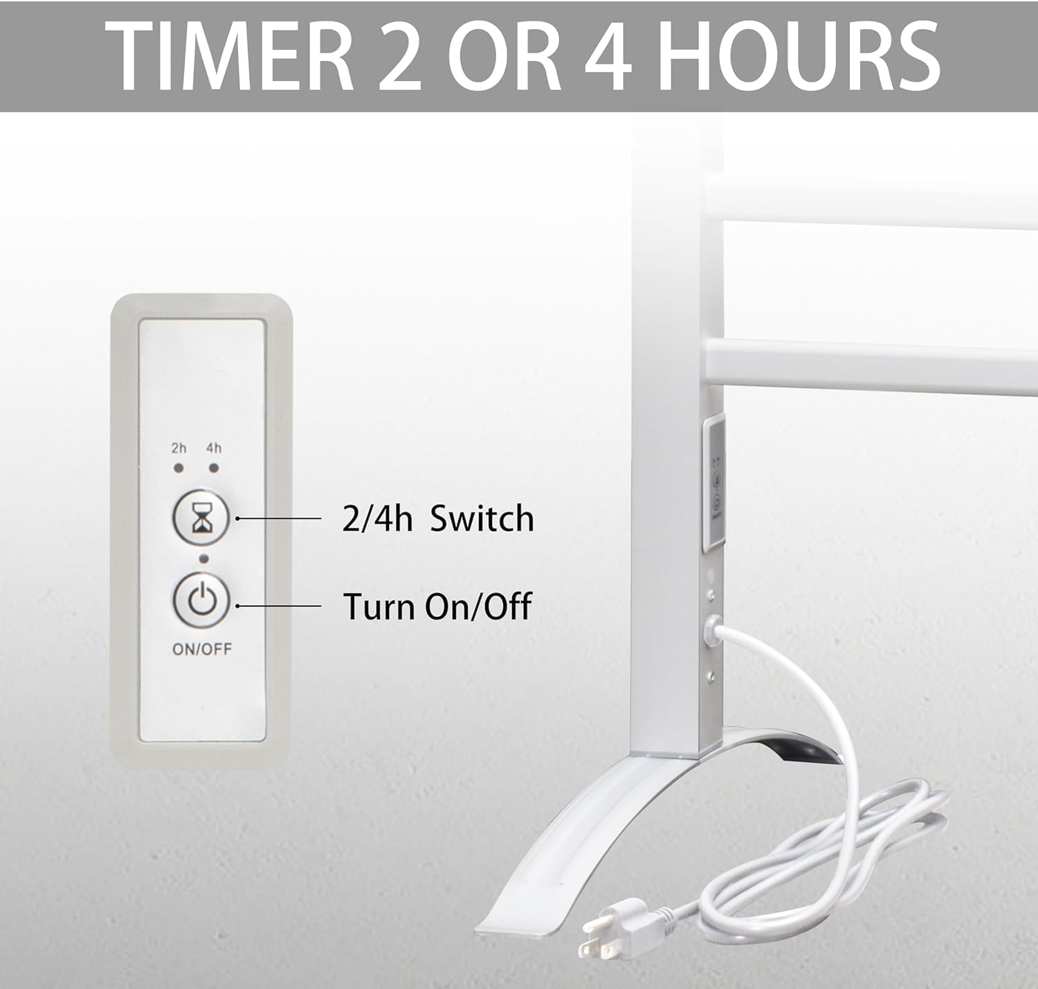 - Timer & LED Indicators: The towel warmer has a built-in countdown timer of 2h or 4h with a visual LED indicator. Press the 2 or 4 hour buttons will dry your towels, and then it will automatically shut off itself when time is up.