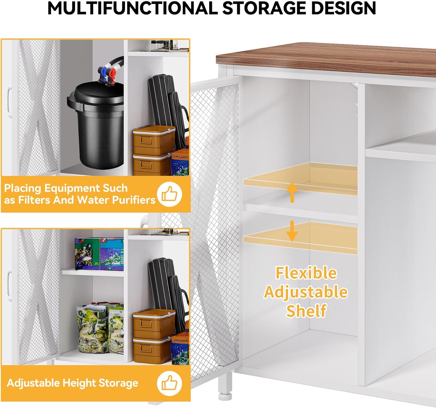 - Orderly storage: This fish tank with stand easily keeps everything organized. The built-in cabinet stores fish food, cleaning tools, and other accessories while the adjustable shelves help accommodate items of various sizes
