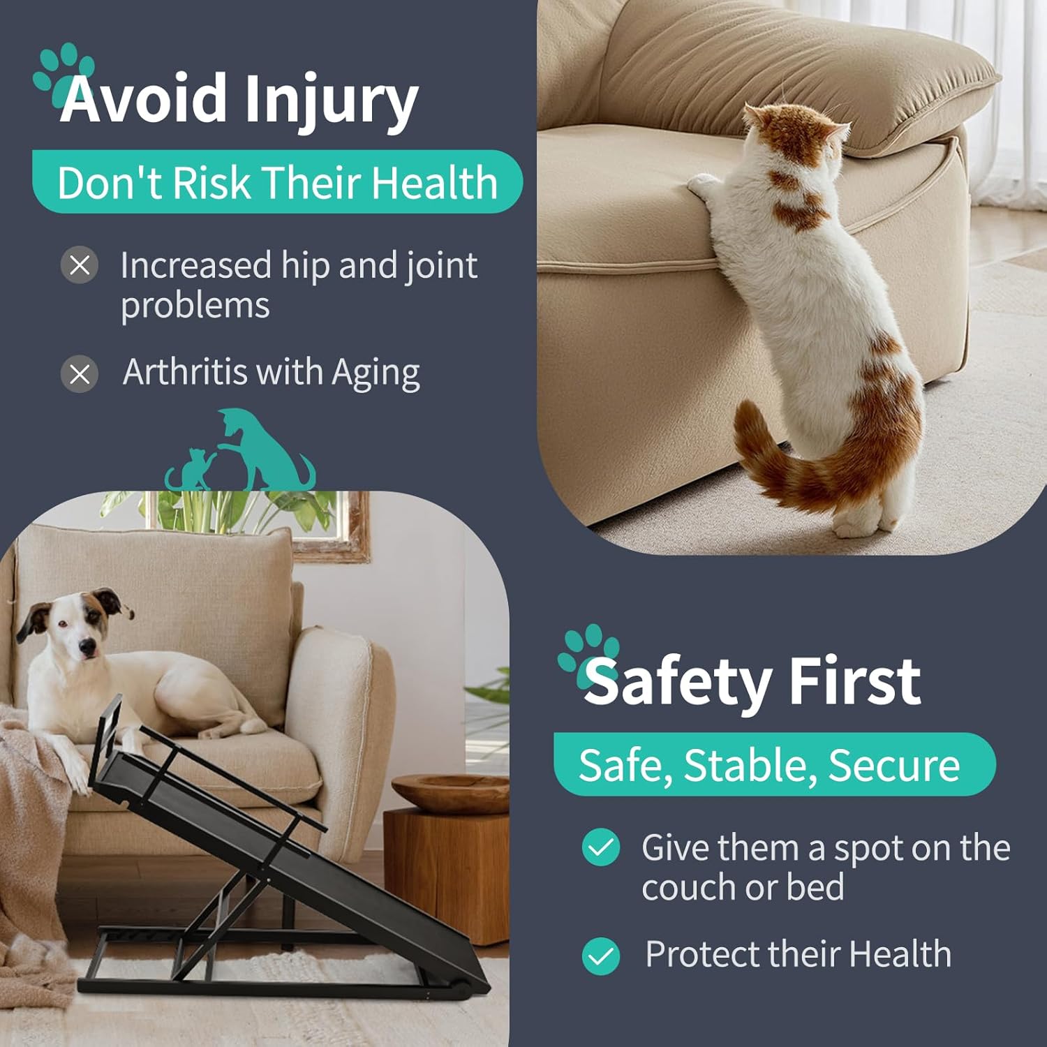 - STURDY & DURABLE: Our pet ramp for dogs and cats is specially made very well - solid wood construction and sturdy stainless steel fasteners, which has been tested to support up to 200lbs. When they jump off the bed, sofa, and sofa, there is no need to worry about getting injured, which provides safety for your pet.