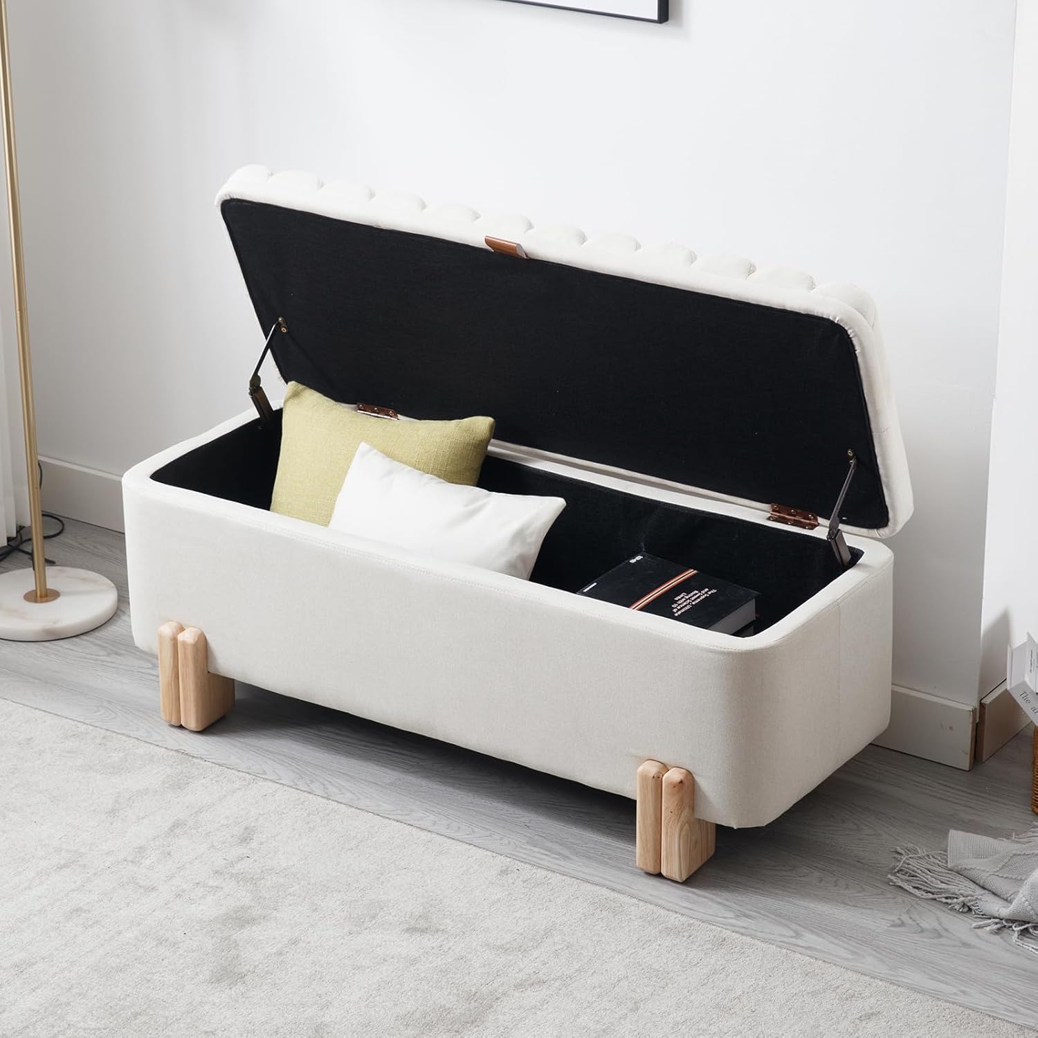 Kmax 45" Storage Bench Linen Entryway Bench Upholstered Ottoman Bench with Wavy Top & Safty Hinge for Bedroom Living Room Hallway, Beige