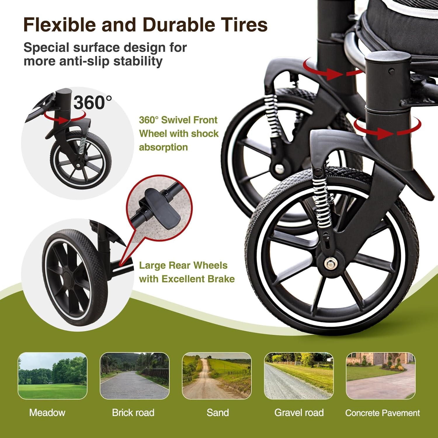 - 【Comfortable and Secure】:The 8” front wheels with 360 degree swivel and 11” rear wheels of this stroller have a professional surface design with a special tread pattern to enhance friction for stability. The front wheels are equipped with shock absorbing equipment, making them ideal for use on brick lawns or other uneven surfaces.There is a removable foam cushion under the seat to give your friend a cozy experience!