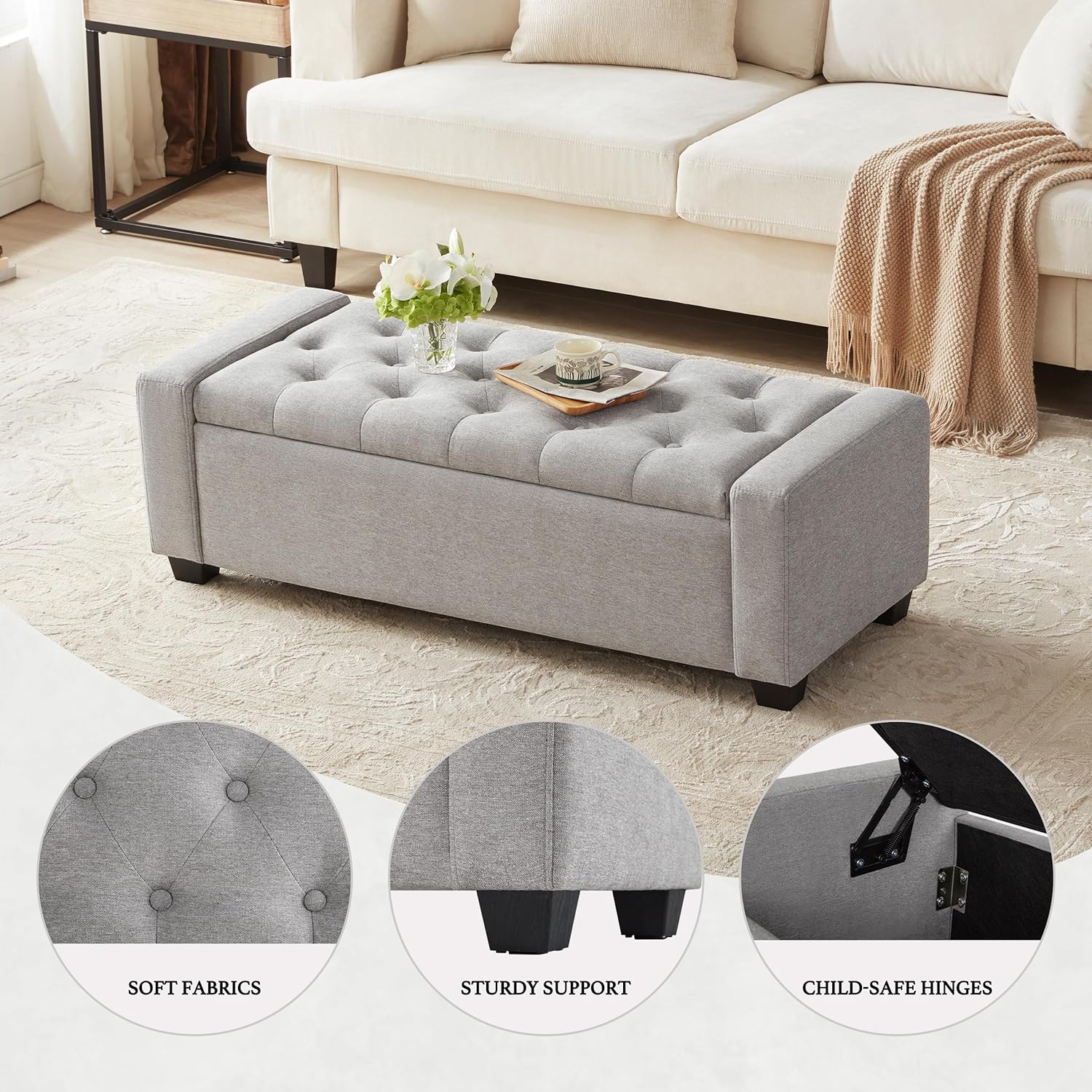 - Button Tufting with Diamond Stitching: Our versatile ottoman bench with storage features high-quality, soft and breathable fabric with no unpleasant odors. The lid is adorned with button tufting and delicate diamond stitching; Enhancing its modern design