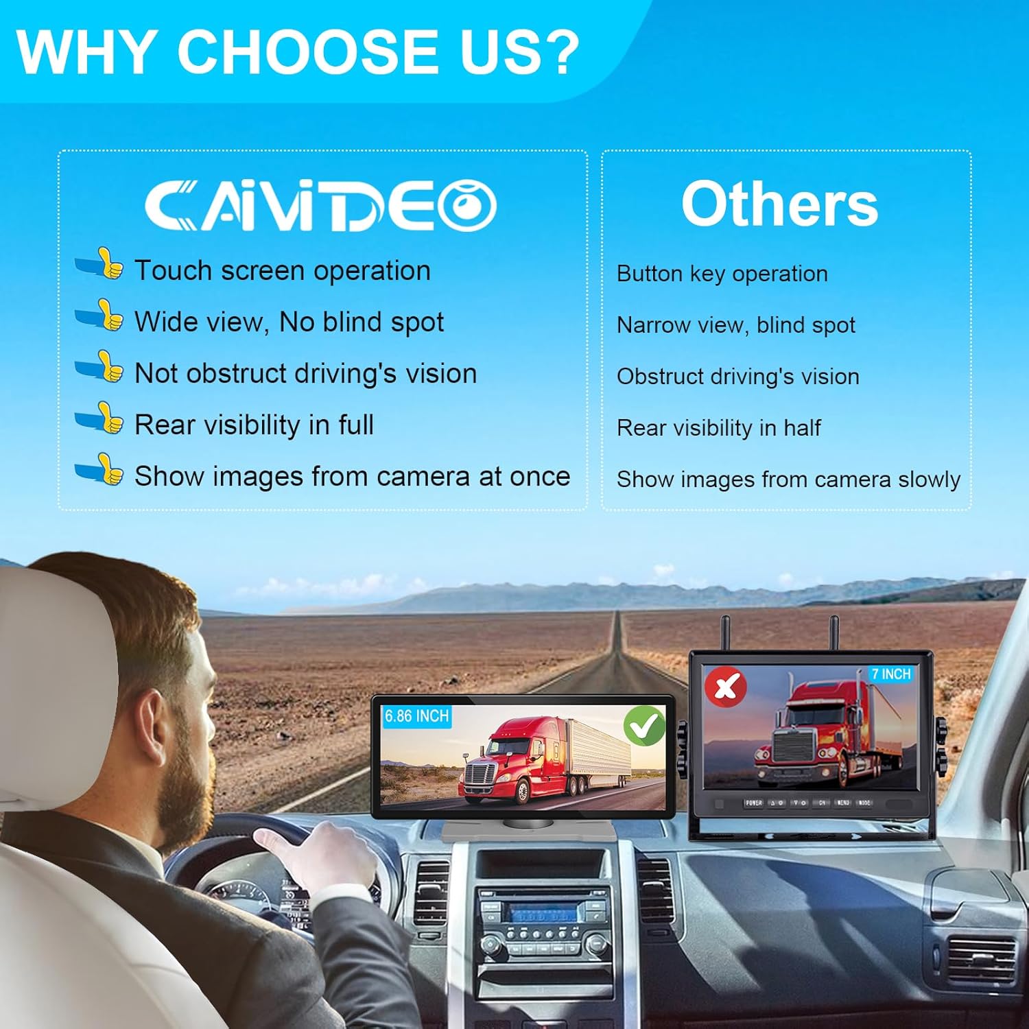 - Touch Operation: Caivideo 6.86" wireless back up camera for truck has no key button and use touch screen to settting the menu and operate the monitor easily. You can easily setting the monitor, such as system time and language, guide line, brightness, auto-brightness, contrast, volume, color, display mirror, auto cycle record and playback the video. The monitor offer 4 different mirror images and 6 different display modes, and you can touch select mirror or display mode according to your needs.