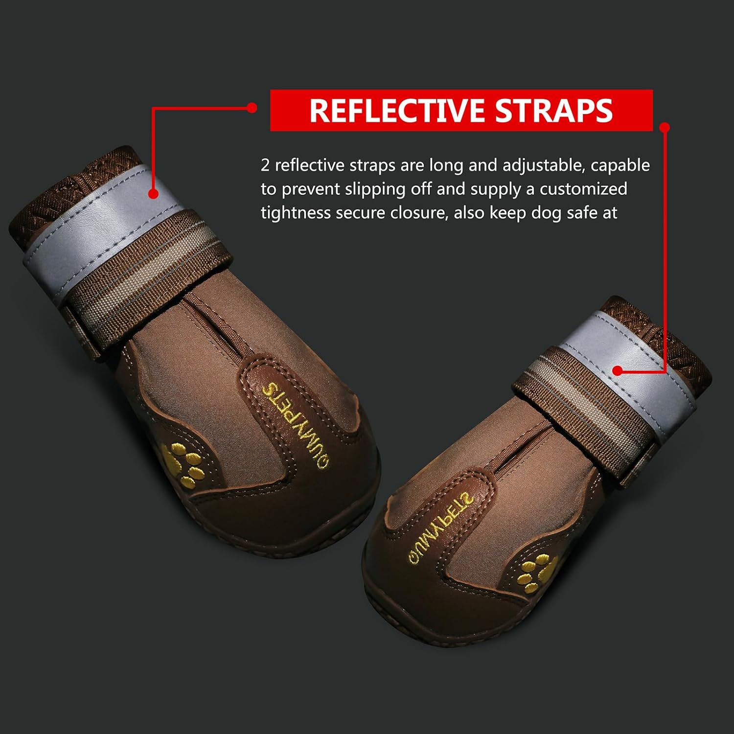 - SECURE and ADJUSTABLE: Easy to put on / off. These dog shoes expands with a wide split seam opening and two adjustable and reflective straps to ensure a tight fit, also make your dog safe at night.