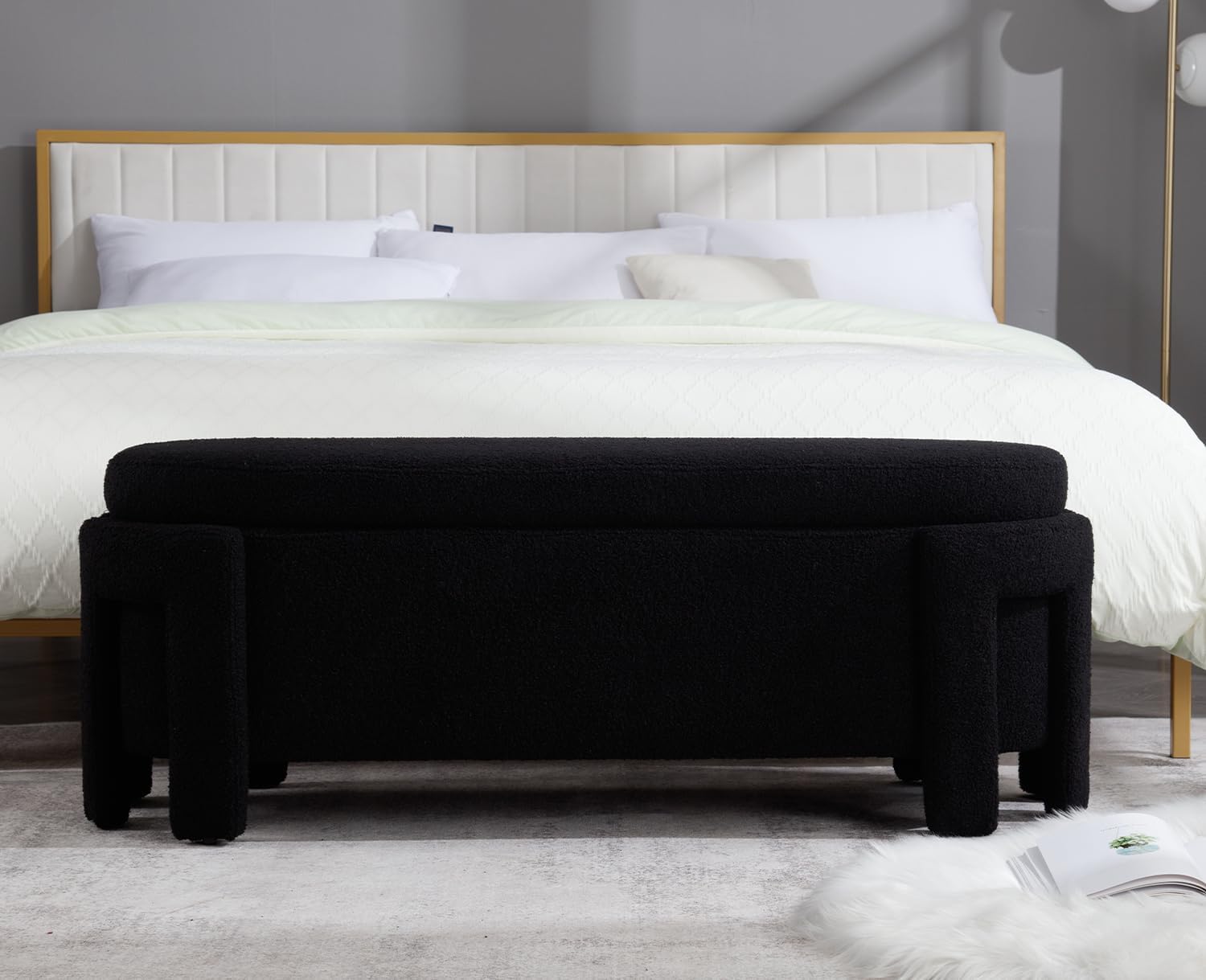 Kmax 50" Storage Ottoman Bench Modern Faux Fur Boucle Entryway Bench Comfy Upholstered End of Bed Bench for Hallway Entrance Bedroom Corner, Black