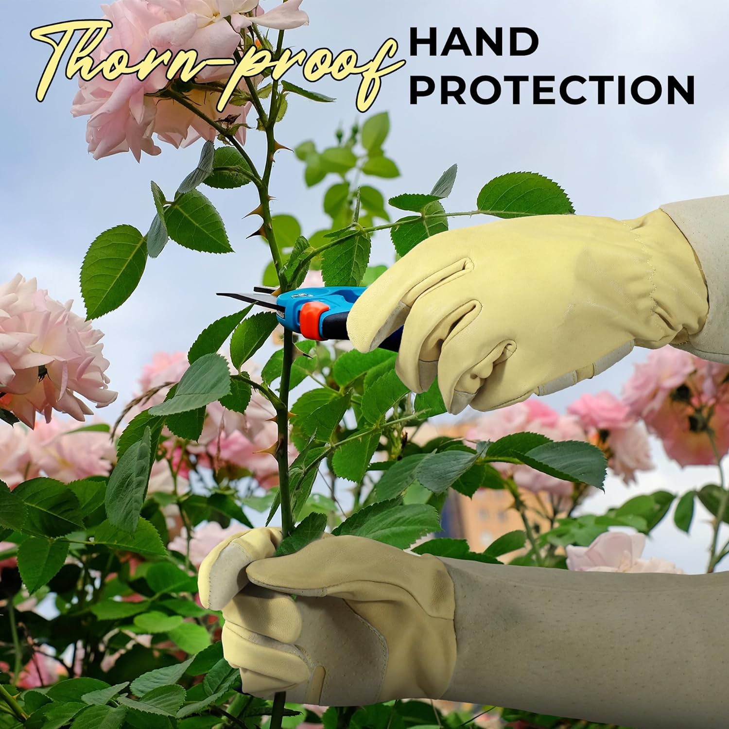 HANDLANDY Rose Pruning Gardening Gloves for Men Women, Thorn Proof Forearm Protection Leather Garden Gloves, Gardening Gifts for Gardeners (Beige- goatskin, Large (Pack of 1))