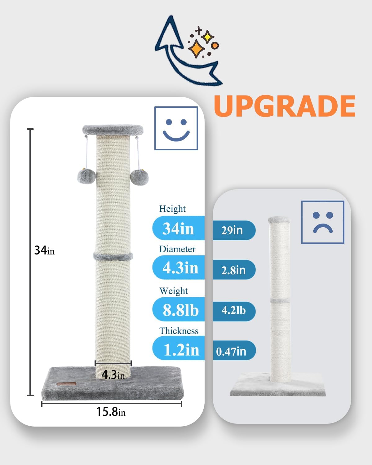 - Tall and Sturdy: Our 34-inch tall cat scratching post is designed to provide ample height for cats to stretch and scratch comfortably. The sturdy construction ensures stability during vigorous scratching sessions, making it a durable choice for indoor cats of all sizes and ages.